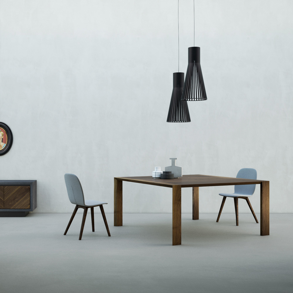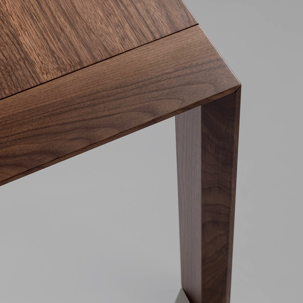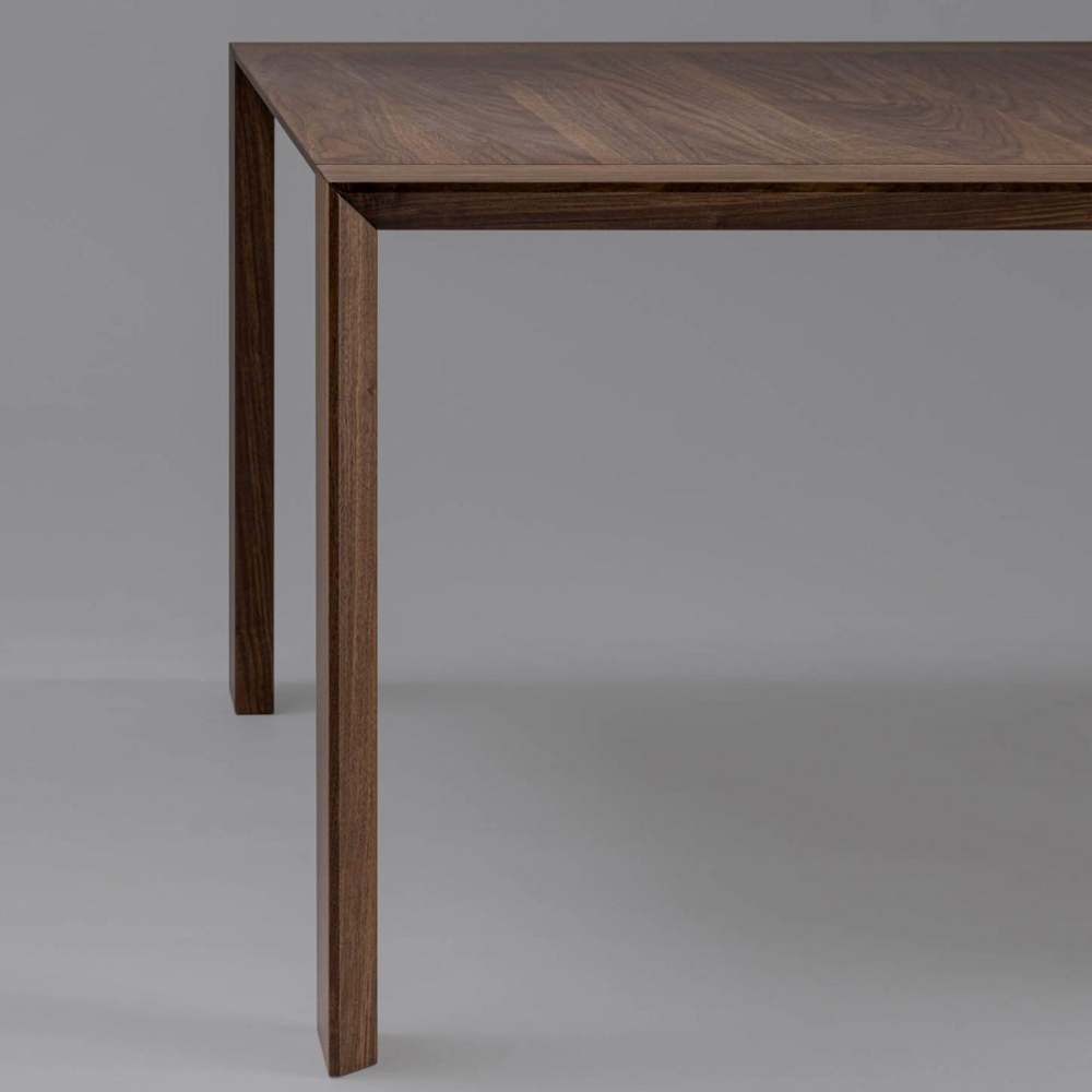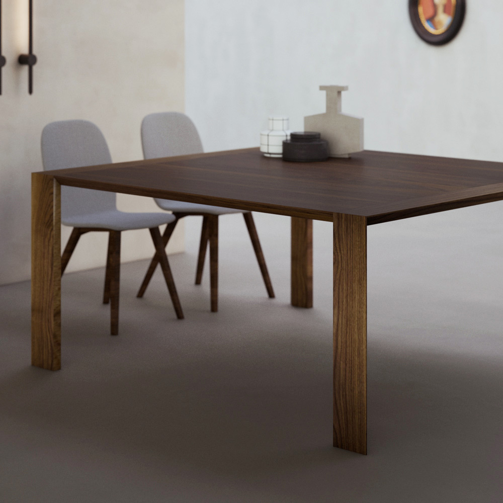 Pevný stůl se zkosenými nohami dýhovanými na laminu a deskou dýhovanou na topolové dřevotřísce v barvě ořech canaletto .