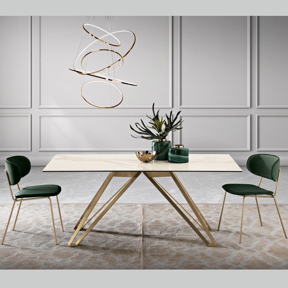 Tento stůl ohromující svým kontrastem materiálů a barev je skutečným vyjádřením luxusu a moderního designu. Sklokeramická deska s mramorovým efektem calacatta s jemnými odstíny je oslavou přirozené elegance, odolná a zároveň extrémně rafinovaná.