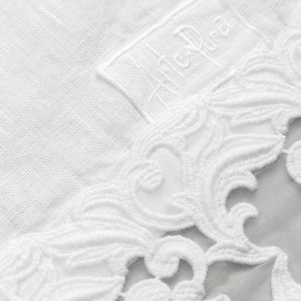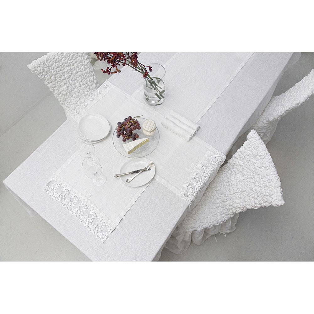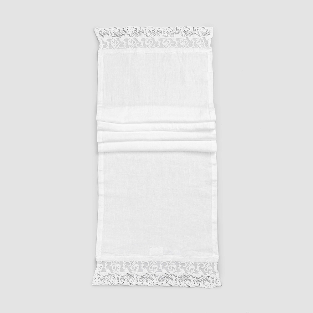 Čistě bílý plátěný běhoun se dvěma variantami krajkové dekorace, elegantní a luxusní design vyrobený v Itálii.