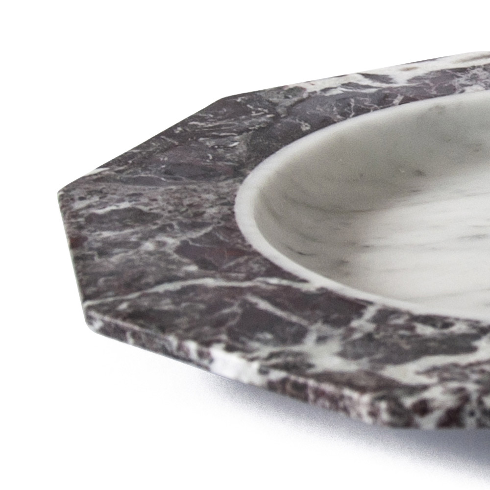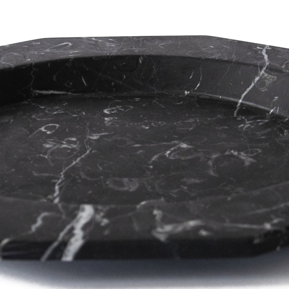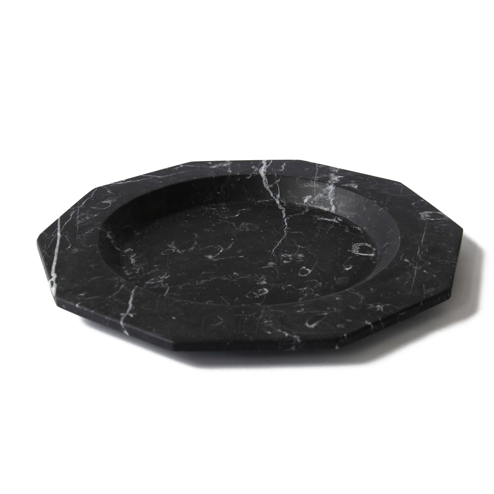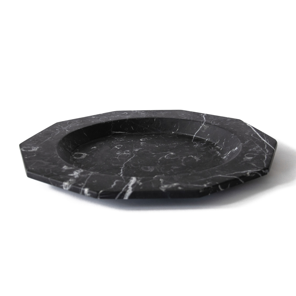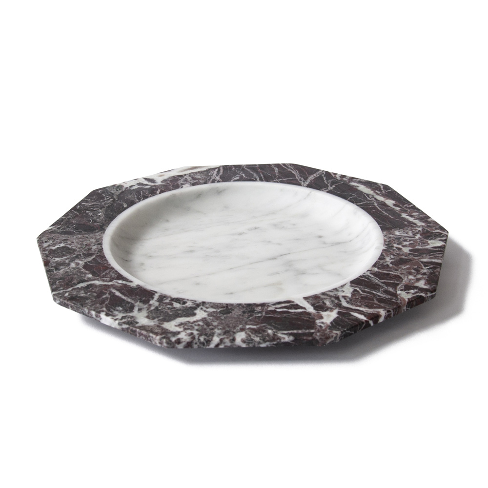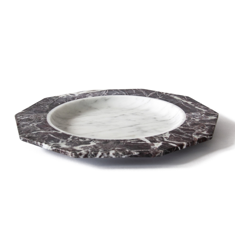 Saténový talíř v bílé, černé nebo bílé a červeném mramoru Levanto vyrobený v Itálii.