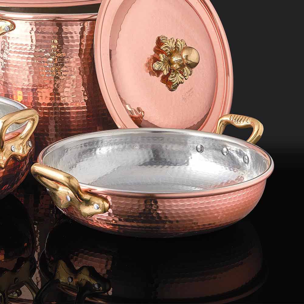 Kulatá pánev z pocínované a ručně tepané mědi s poklicí, vyrobená v Itálii.