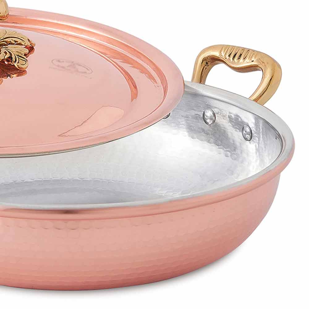 Kulatá pánev z pocínované a ručně tepané mědi s poklicí, vyrobeno v italském designu.