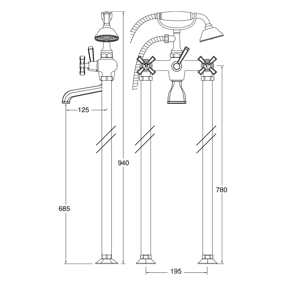 podlahová sestava vany s ruční sprchou a flexibilní hadicí, vyrobená z mosazi.