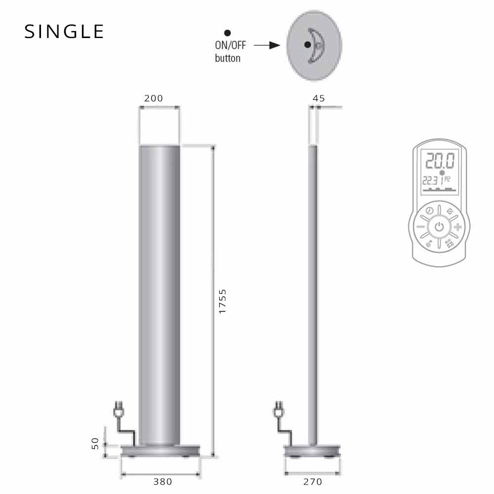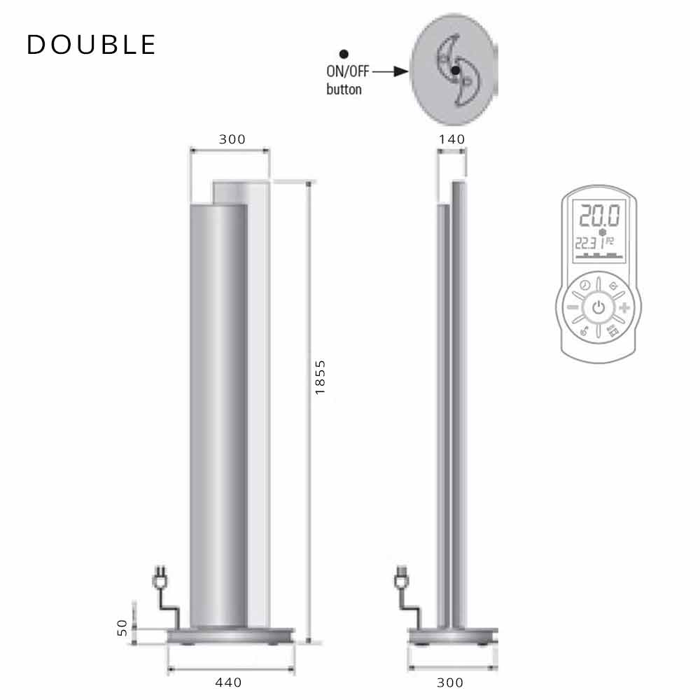 udržování teploty. Tento ohřívač má výkon 250 W pro jednoduchou verzi a 500 W pro dvojitou verzi, dodáván se standardním dálkovým ovládáním pro nastavení LED světel a termostatem s denním / týdenním programováním. 1,5metrový kabel se zástrčkou Schuko. Jednofázové napájení 230 V.
