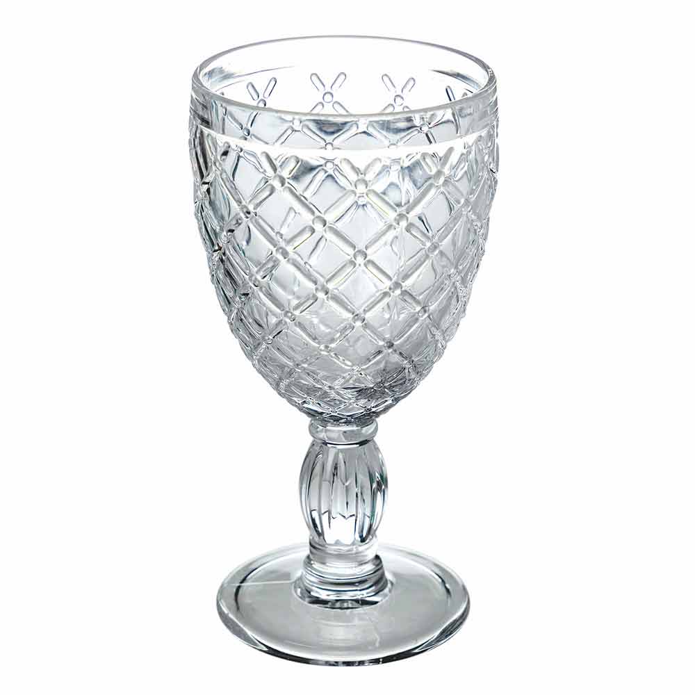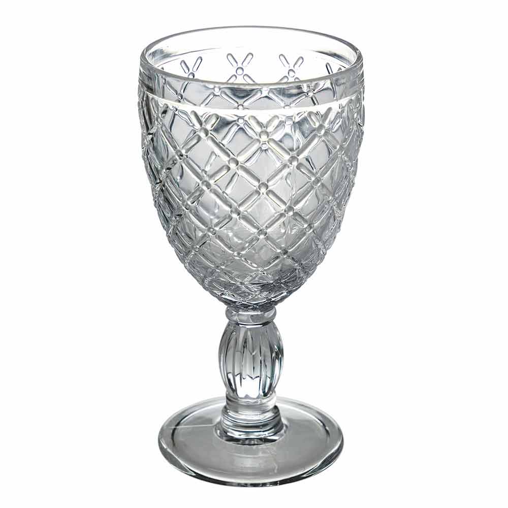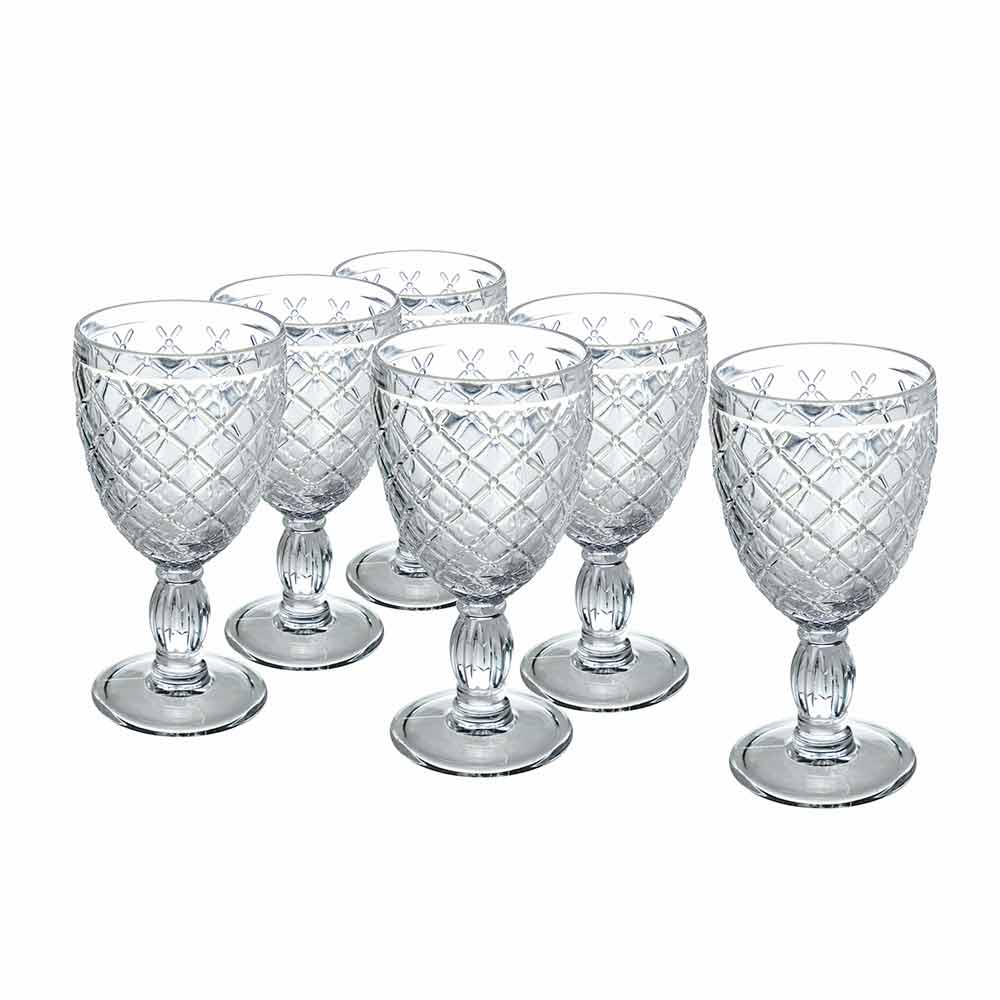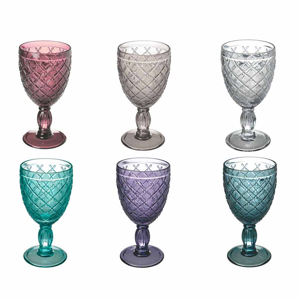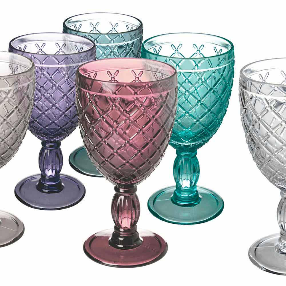 Sada barevných nebo průhledných pohárů na víno nebo vodu ve skle s vyřezávanými dekoracemi, 12 kusů.