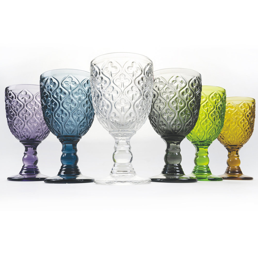 Sklenice na víno z barevného skla s ozdobami na povrchu, 12 kusů.