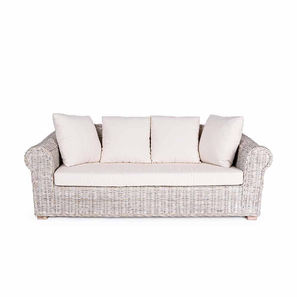 Etnický design třímístná pohovka pro vnitřní i venkovní použití, vyrobená z ratanu a kubu.