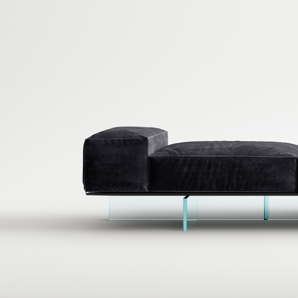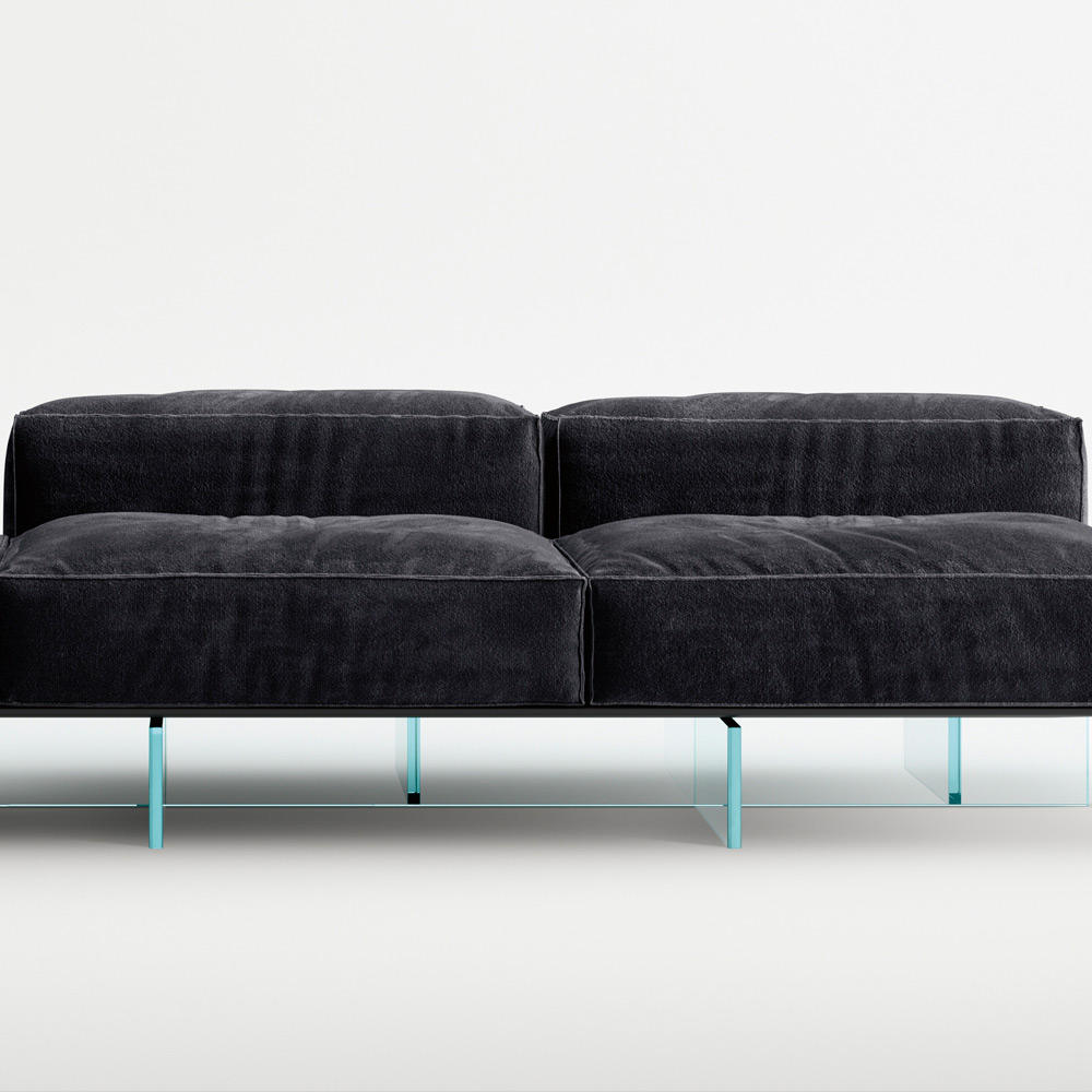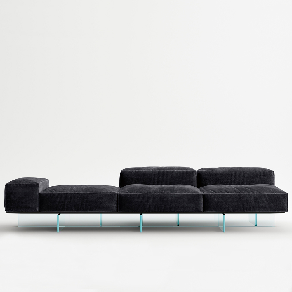 Sedací systém, složený z měkkých a velkoryse polstrovaných objemů, představuje nový způsob navrhování obytného prostoru s prvky, které umožňují originální, dynamičtější a neformální kompozice. Pohovka si zachovává svou vizuální lehkost díky základně, kterou tvoří nohy z vrstveného skla nesoucí dřevěnou platformu, na které spočívají čalouněné prvky. Sofistikované vysoce kvalitní látky a rafinované detaily v balení jsou charakteristické rysy projektu s nekonvenčním charakterem.