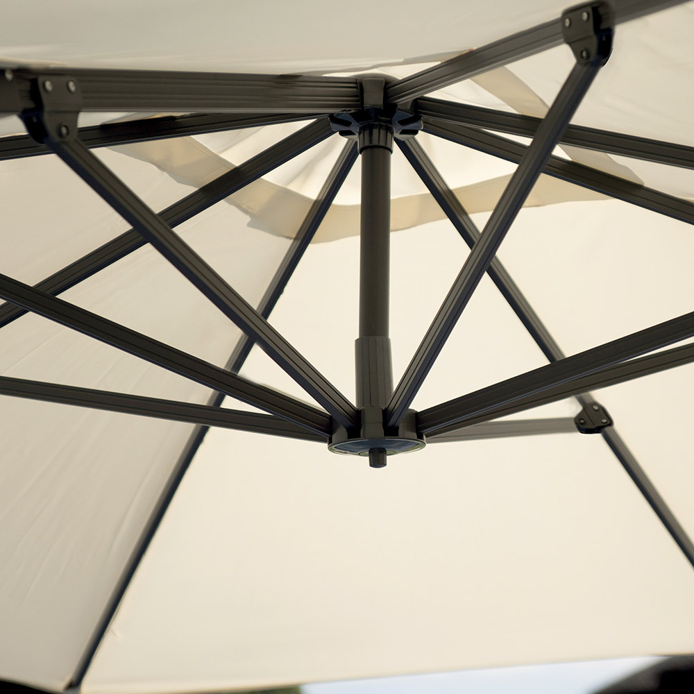 Stříška z 250g ecru polyesteru poskytuje vynikající ochranu před slunečními paprsky a je vysoce odolná vůči povětrnostním vlivům, čímž vytváří prostorný a příjemný stín. Díky systému otáčení o 360° lze slunečník snadno nastavit podle polohy slunce a vždy tak nabízí maximální pokrytí a pohodlí.