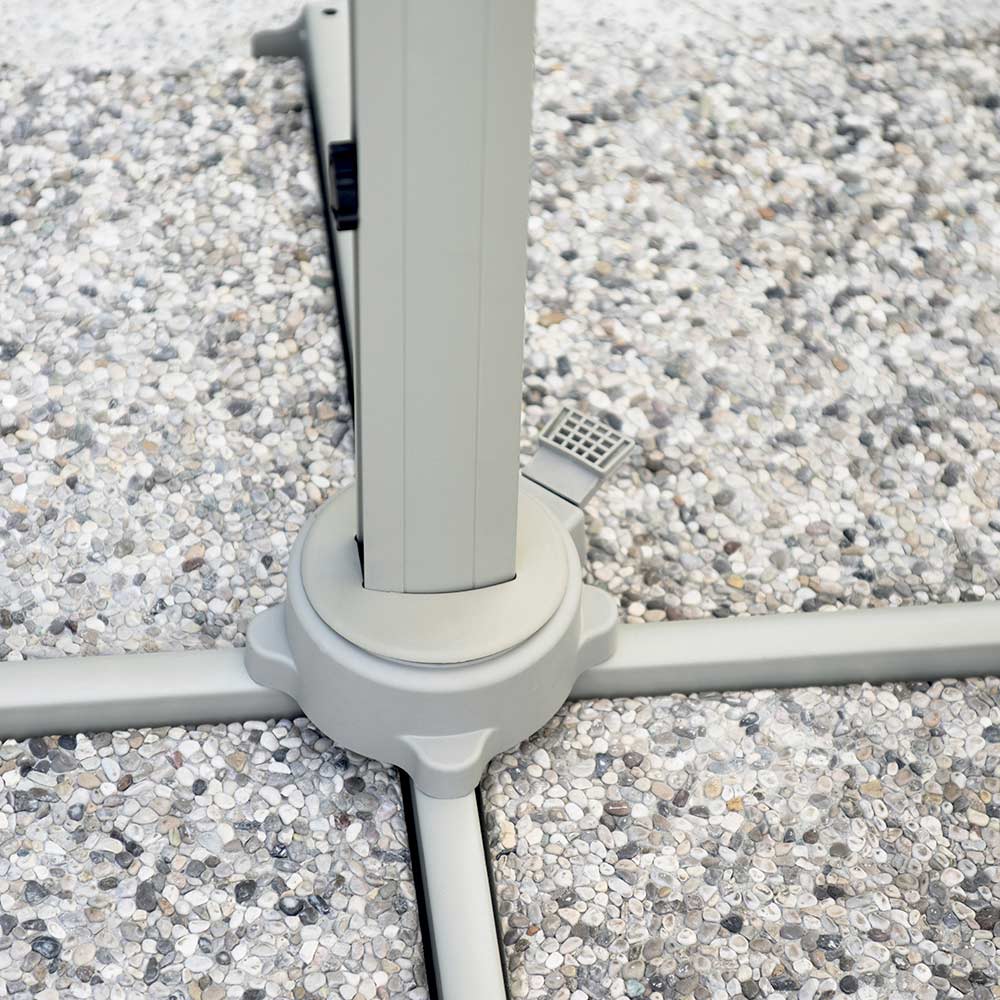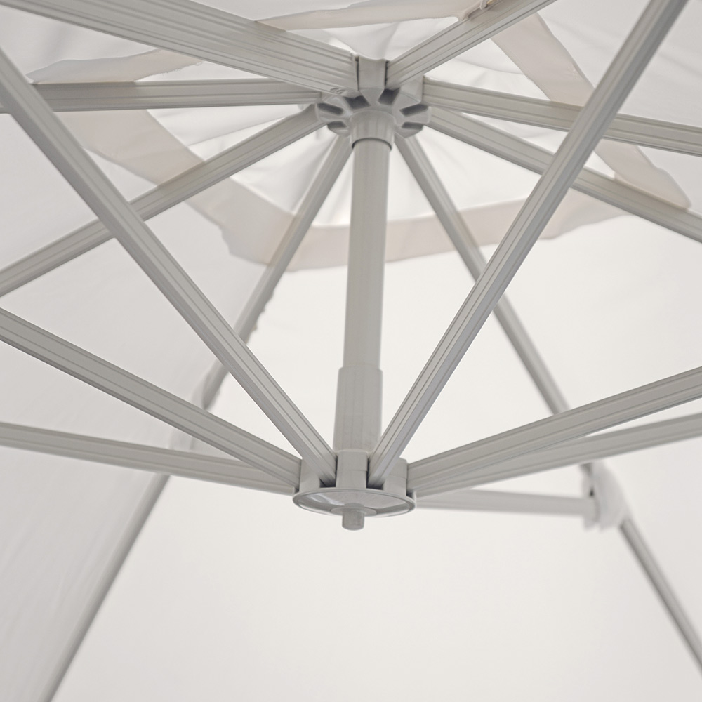 Tento boční slunečník kombinuje moderní design, praktičnost a odolnost a nabízí elegantní pokrytí pro jakýkoli venkovní prostor. Hliníkový rám s tyčí o rozměrech 77 x 53 mm a osmi žebry o rozměrech 14 x 24 mm zajišťuje stabilitu a robustnost a zároveň zachovává čistý a moderní estetický vzhled.