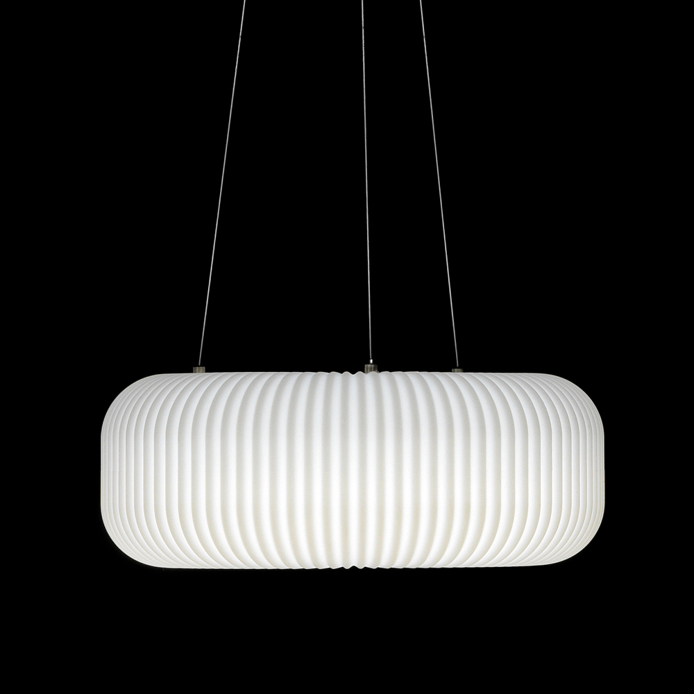 Tato lampa vyniká svým elegantním a minimalistickým designem, který kombinuje tenké kovové kabely s organicky tvarovaným plastovým difuzorem. Plast, zpracovaný s plisovanými detaily, dodává nádech vizuální kultivovanosti a pomáhá jemně a rovnoměrně rozptýlit světlo, čímž vytváří přívětivou a relaxační atmosféru.