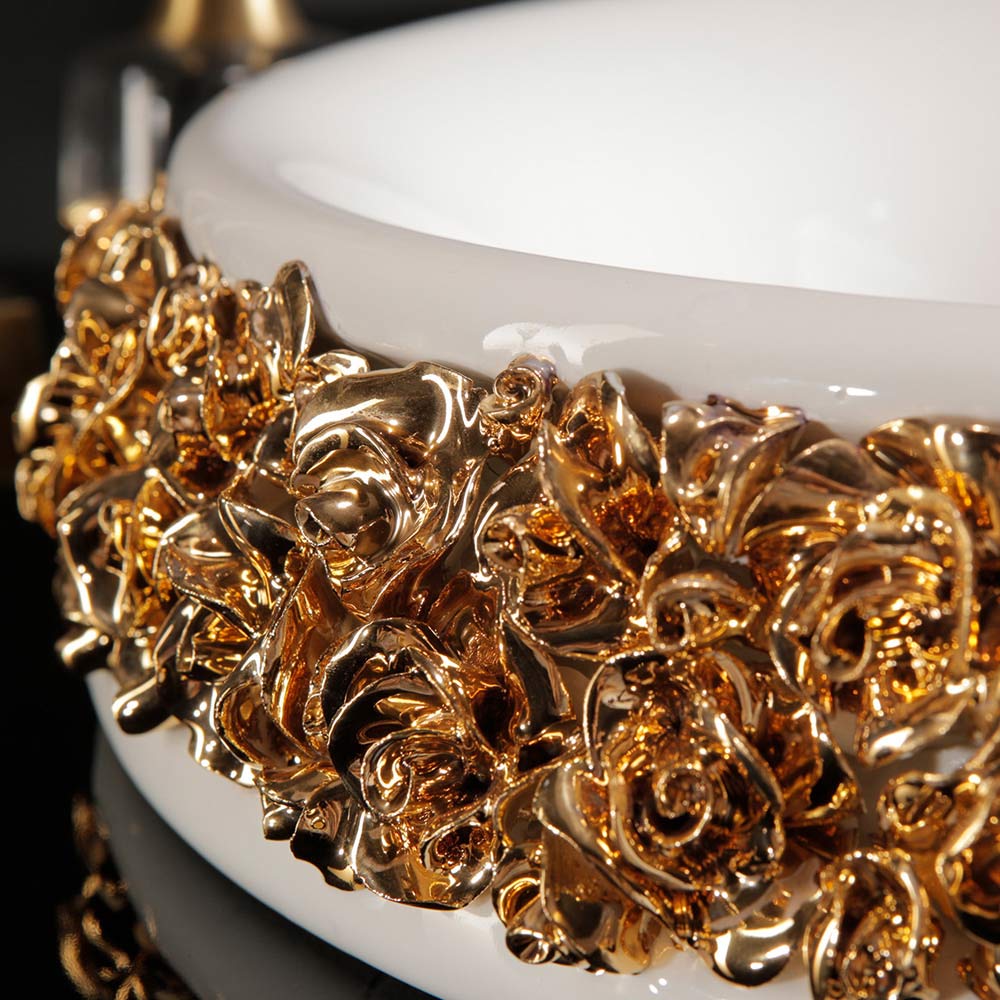 - lesklé bílé umyvadlo se zlatými lístky