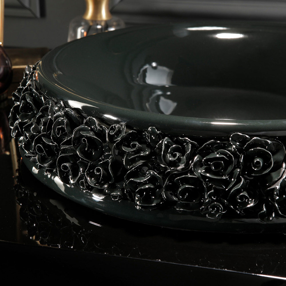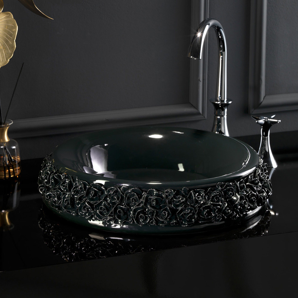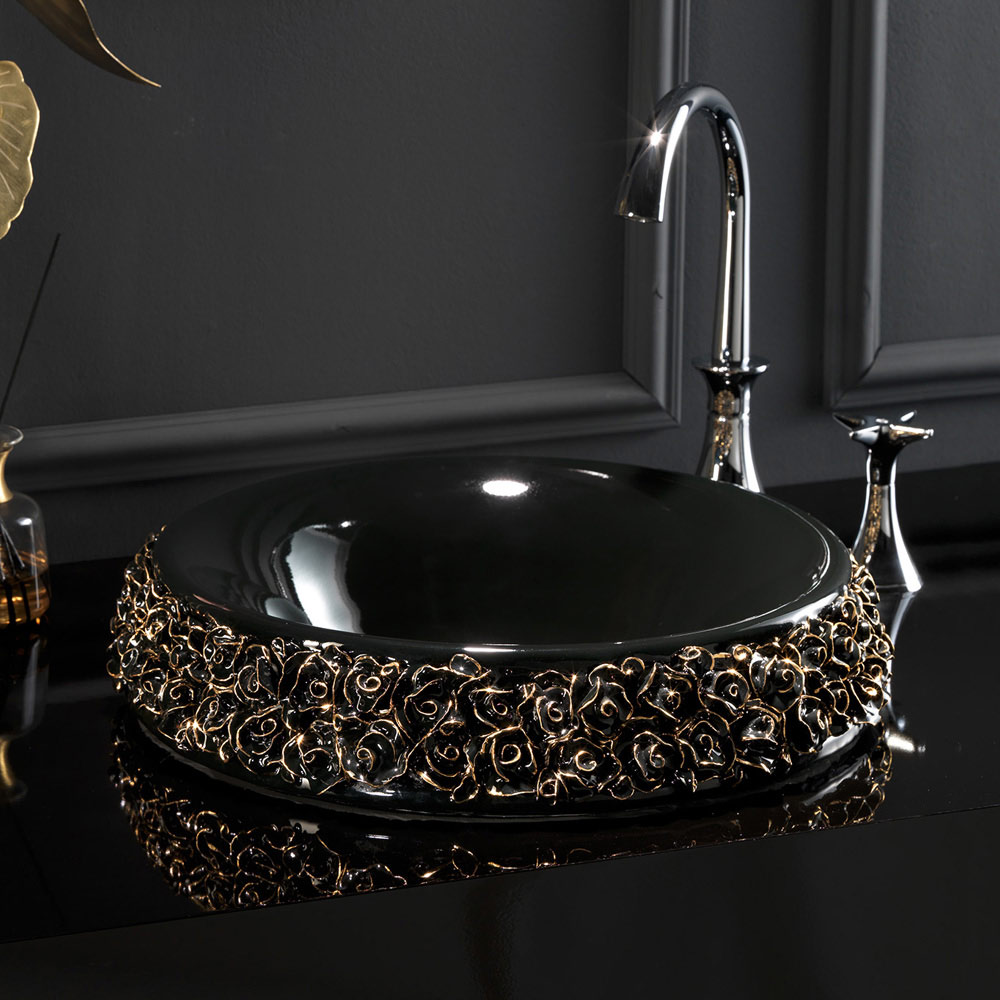 - lesklé černé umyvadlo se zlatými lístky