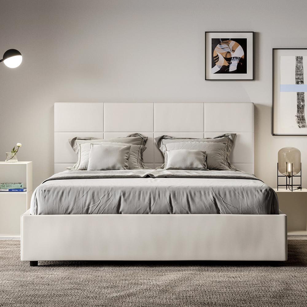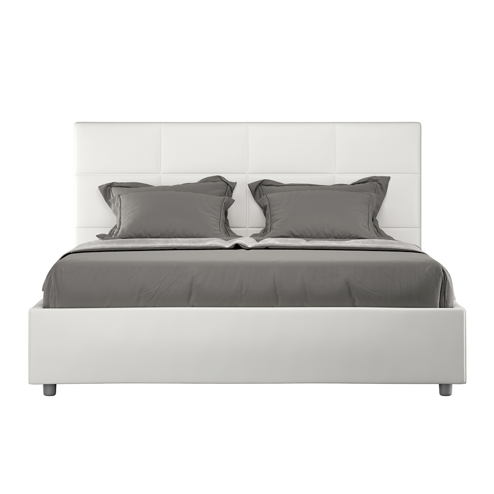 Čalouněná manželská postel o rozměrech 160x200 cm vyrobená z dřevotřískových panelů a potažená imitací kůže , kompletně vyrobená v Itálii. Tato postel s polstrovaným rámem je dokonalým příkladem toho, jak lze eleganci a pohodlí spojit v jednom kusu nábytku. Tento model se vyznačuje...Čelo postele s obdélníkovými geometrickými vzory . Čalouněné umělou kůží se snadno udržuje v čistotě: k rychlému a účinnému čištění postačí pouze hadřík z mikrovlákna.
