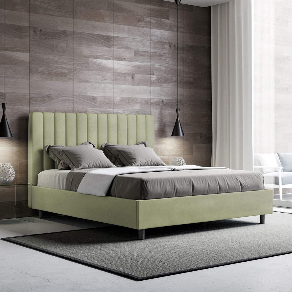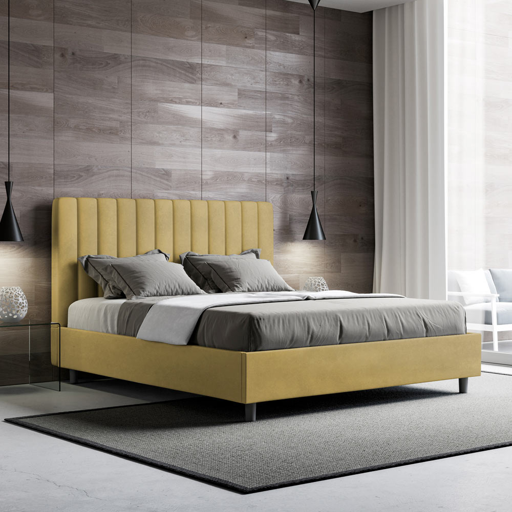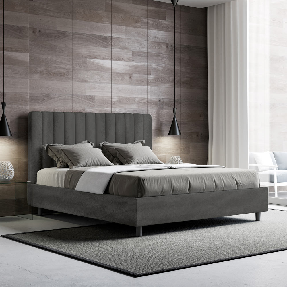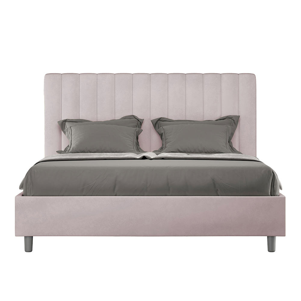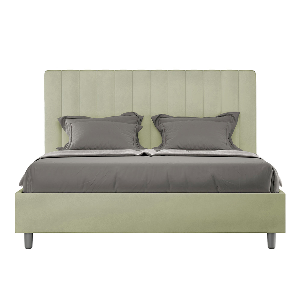 Čalouněná manželská postel o rozměrech 160x200 cm vyrobená z dřevotřískových panelů a potažená mikrovláknem , kompletně vyrobená v Itálii. Tato manželská postel s čalouněným rámem je ideální pro ty, kteří hledají výrazný kousek postele, aniž by byl příliš dramatický. Postel se pyšní minimalistickým čelem s jemným prošívaným efektem symetrických svislých linií , které se krásně hodí do jakéhokoli prostředí, ať už moderního nebo klasického.