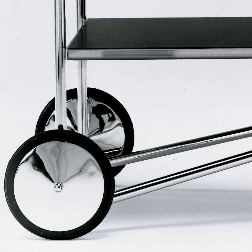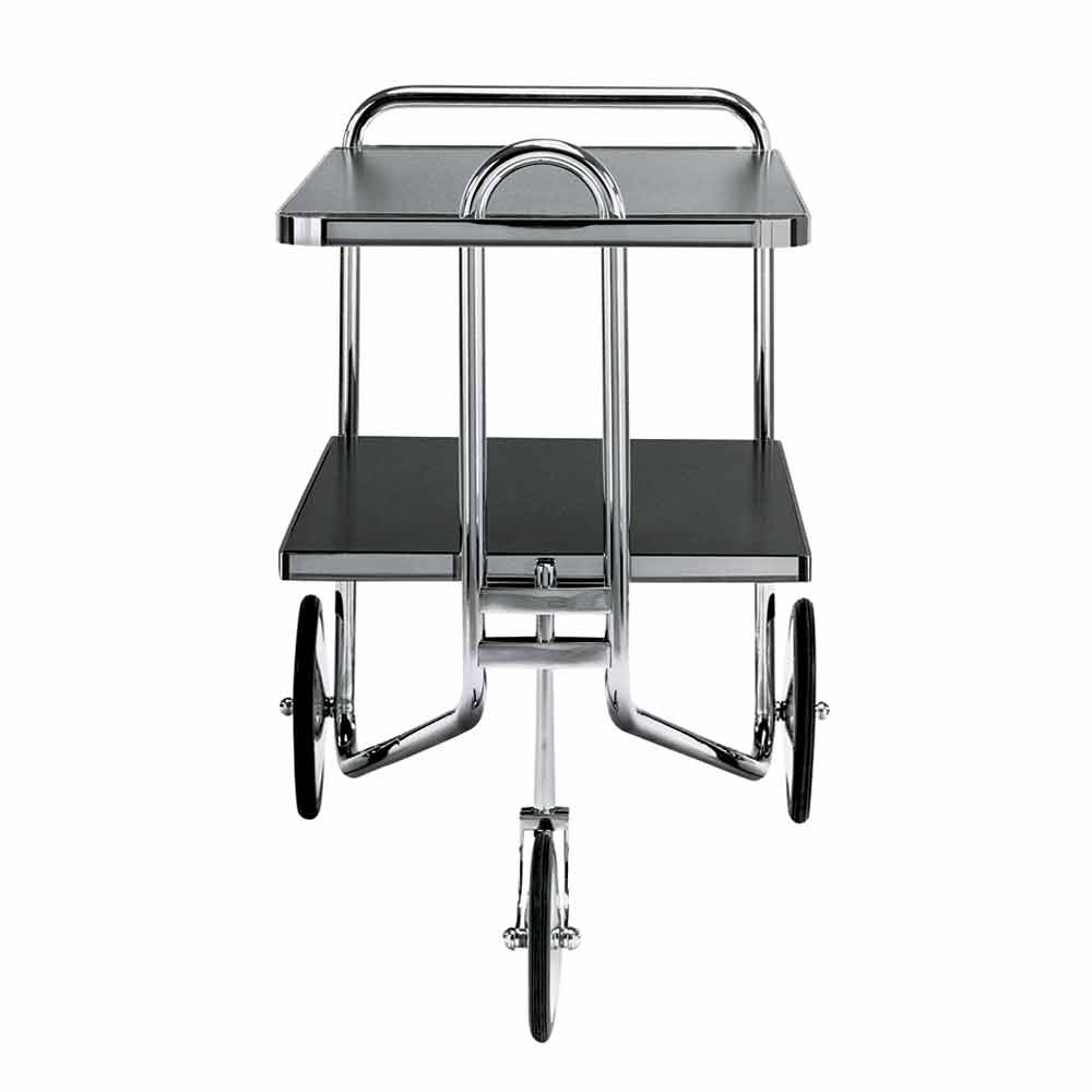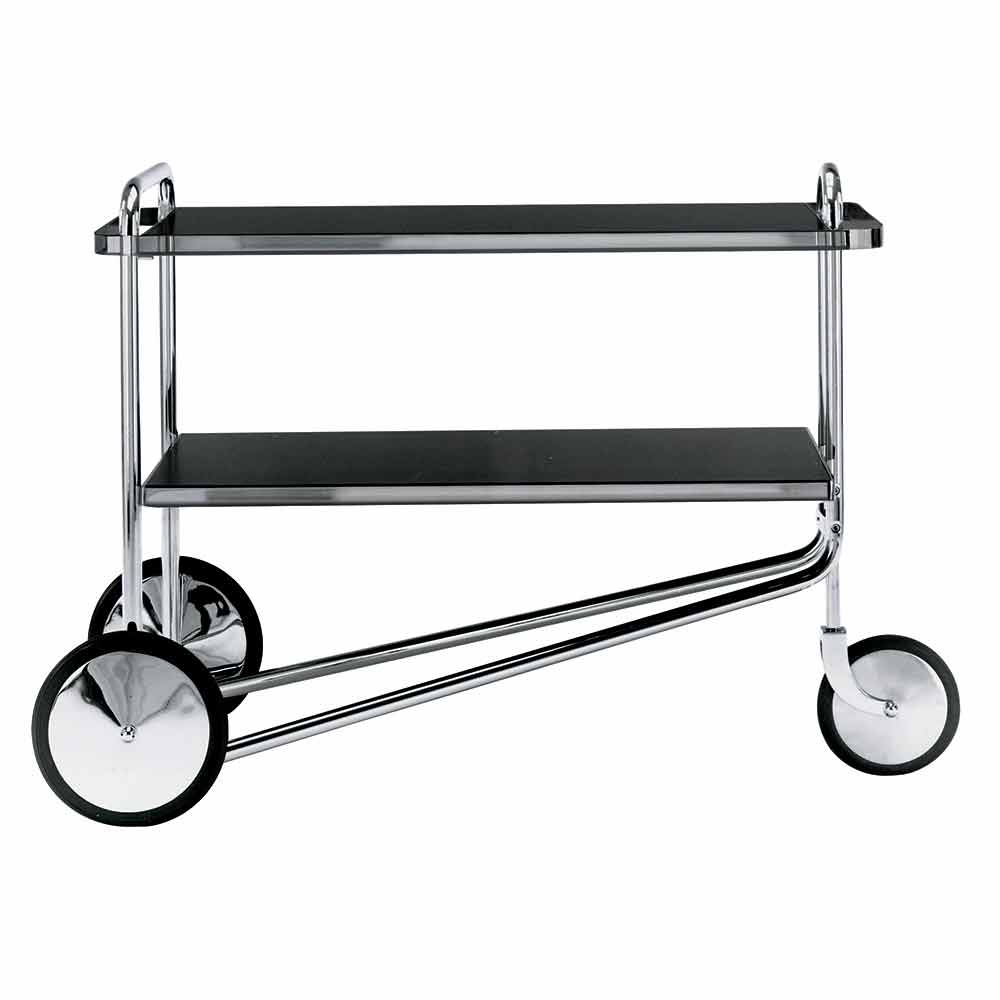 Potravinový vozík s chromovanou ocelovou konstrukcí vybavený 3 kolečky a dvěma policemi z černého laminátu. Praktičnost a design společně dávají život vysoce funkčnímu a pomocnému kusu nábytku v domácím prostředí, jehož použití ještě více usnadňují praktická kolečka, která umožňují jeho rychlé a snadné přemisťování. Kromě čistě funkční stránky nabízí tento vozík na potraviny inovativní a vytříbený estetický ideál pro ty, kteří chtějí doplnit svůj nábytek nádechem nového stylu .
