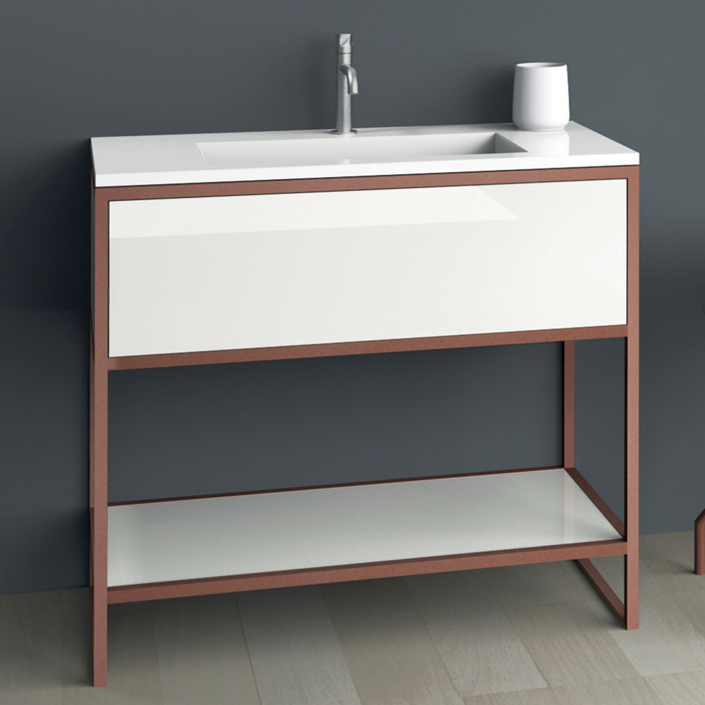 koupelnového nábytku se vyznačuje strukturou vyrobenou z tenkého kovového profilu lakovaného saténovou mědí, který rámuje dveře a polici v leskle bílém lakovaném MDF a vytváří harmonickou kombinaci plných a prázdných prostor. Kovová povrchová úprava dveří zdůrazňuje