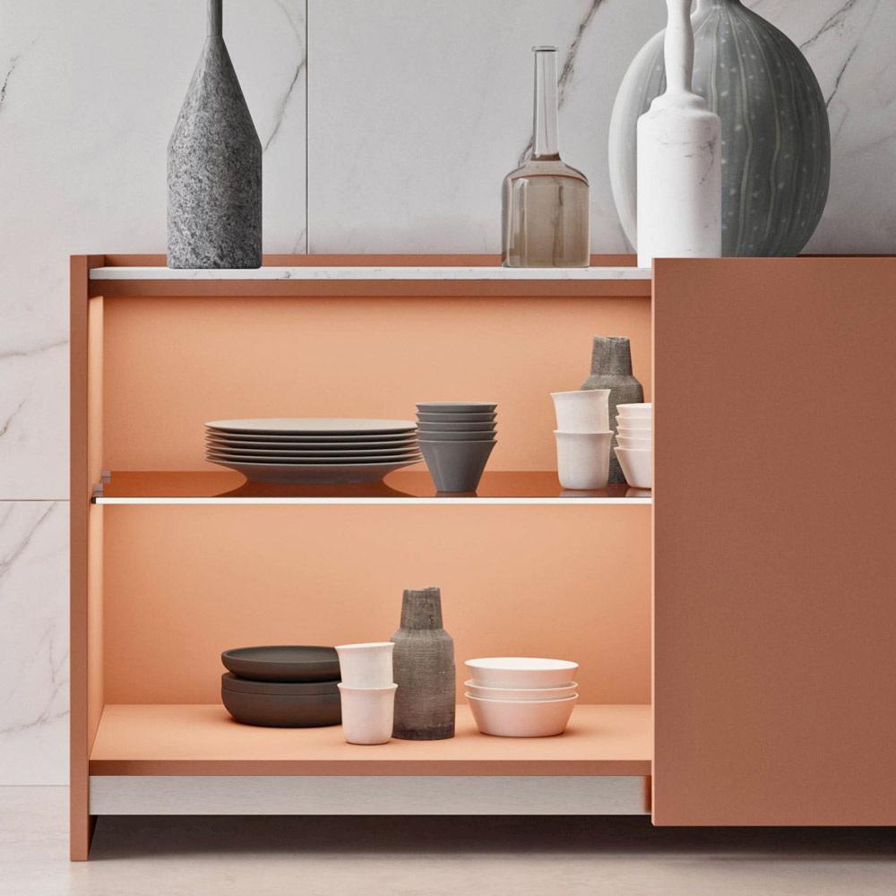 příborník do obývacího pokoje má konstrukci a boky vyrobené ze skořicového matného laku s elegantní mramorovou deskou Carrara Venatino.