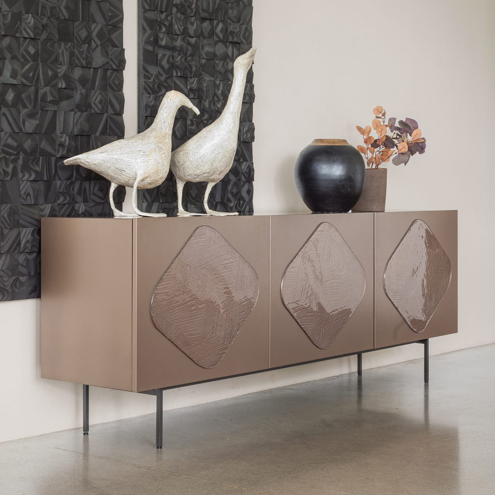 kovové nožky , na kterých příborník spočívá. Tyto nohy zvedají příborník od země a dodávají tak celému nábytku pocit lehkosti a vzdušnosti. Efekt lehkosti je zvýrazněn lesklou vložkou, která charakterizuje dveře, detail, který dodává designu nádech rafinovanosti a modernosti.