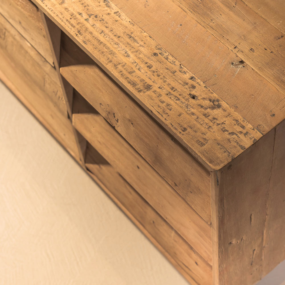 Tento zařizovací set je doslova unikátní právě tím, že ztělesňuje svéráznou historii žité hmoty. Zpracování probíhá z větší části podle řemeslných postupů . Každý škrábanec a nedokonalost, každá jizva na dřevě svědčí o originalitě minulosti, která nabývá nového života. Tropické dřevo legálně recyklované ze starých artefaktů, lodí a opuštěných budov je odborně ošetřeno a kartáčováno, aby znovu získalo důstojnost a lesk. Tento produkt kombinuje podstatu rustikálního vkusu s tvary současného designu as některými detaily industriálního stylu .