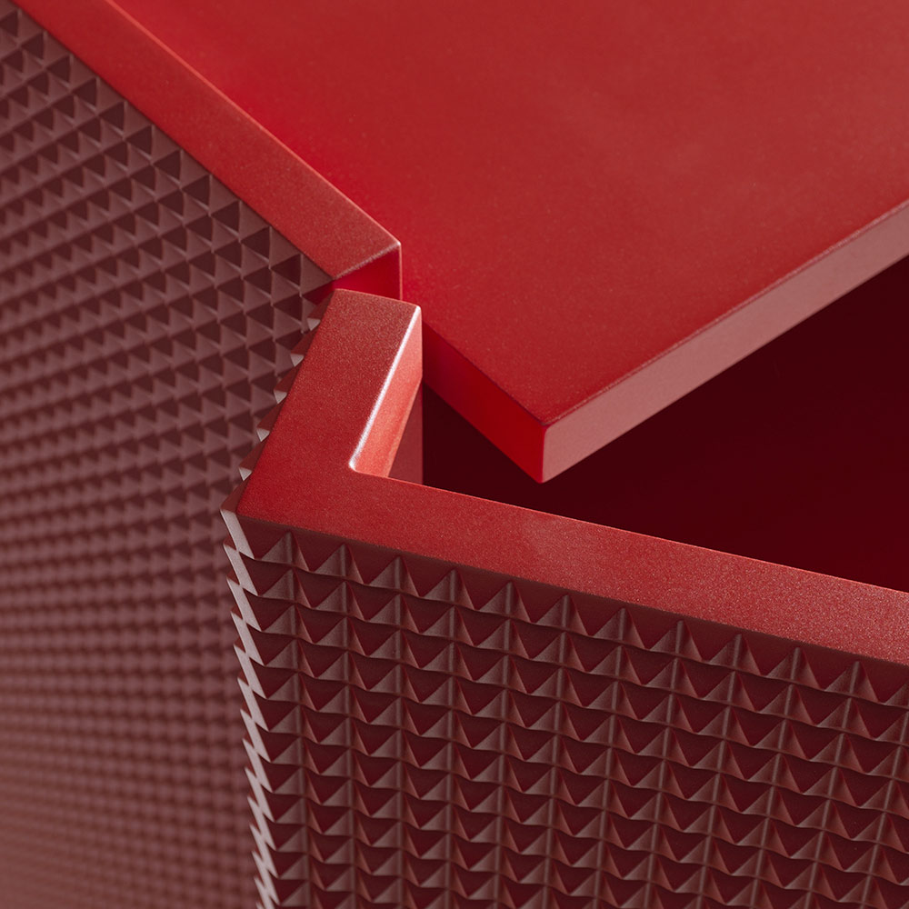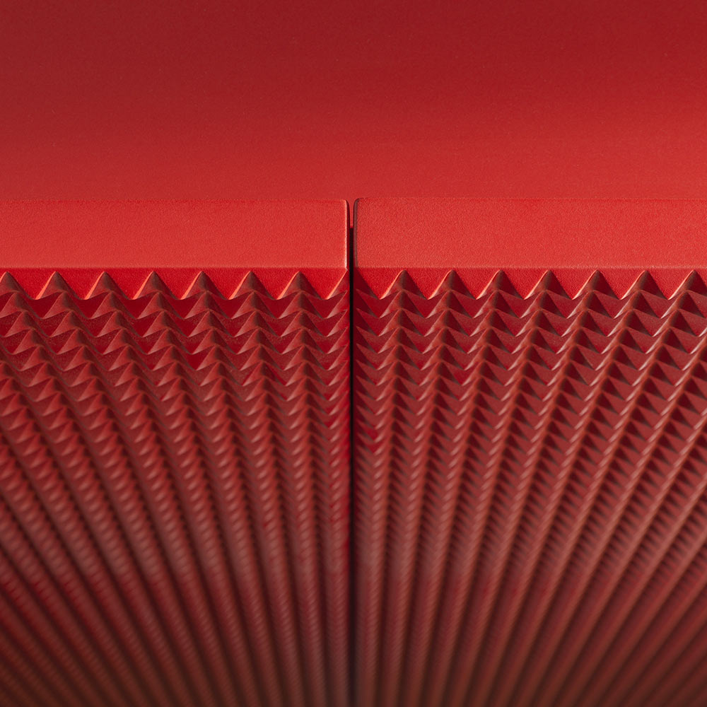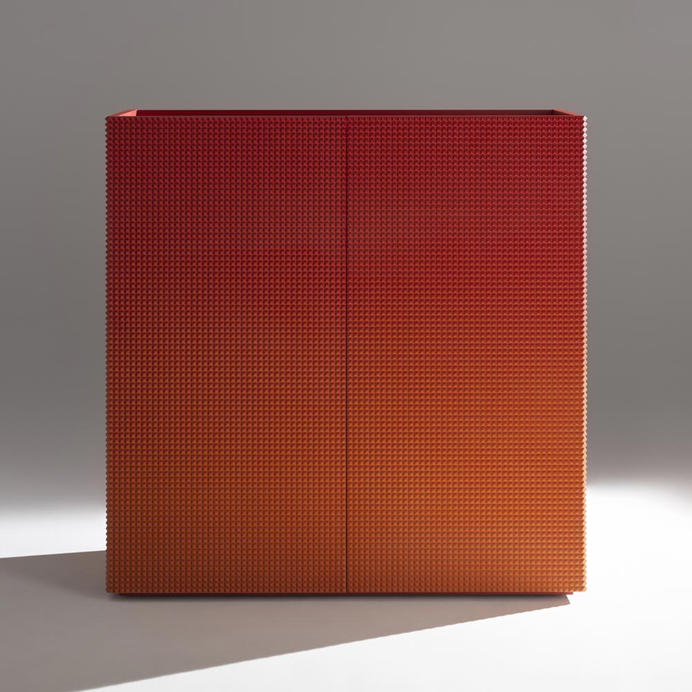 Sošné dílo, které kombinuje materiálnost a eleganci v dokonalé rovnováze mezi estetikou a funkčností . Tato dvoudveřová příborník vyniká svou ikonickou oranžovočervenou „diamantovou“ povrchovou úpravou , vizuálně výrazným trojrozměrným designem, ručně broušeným před finálním lakováním, čímž se dosahuje zářivého a extrémně sofistikovaného povrchu.