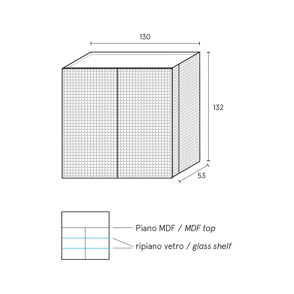 Dveře se otevírají do stran pomocí zapuštěných pantů , což je řešení, které zajišťuje formální čistotu a kontinuitu linií. Ukončený zadní panel umožňuje umístění i uprostřed místnosti , čímž se kus nábytku promění ve skutečný architektonický prvek.