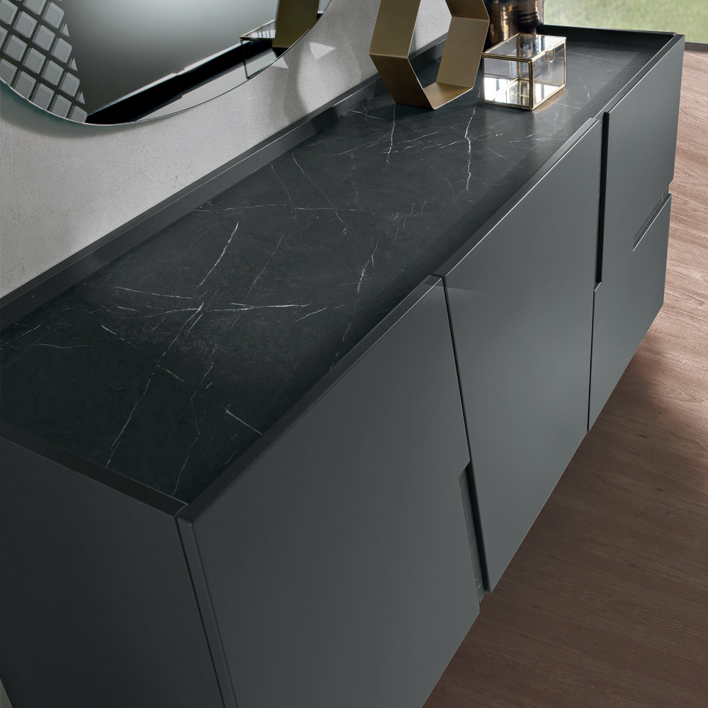Konstrukce je vyrobena z melaminového korpusu a lakovaných MDF dvířek , které vytvářejí jednotný a elegantní povrch. Design je zdoben dekorativními vložkami a kontrastními vrchními deskami , které jsou k dispozici v povrchových úpravách, jako je mramorový efekt , teakový efekt nebo bronzové zrcadlo , což dodává kompozici hloubku a charakter.