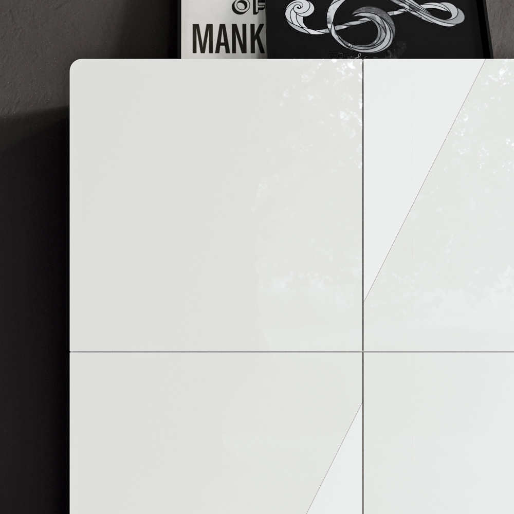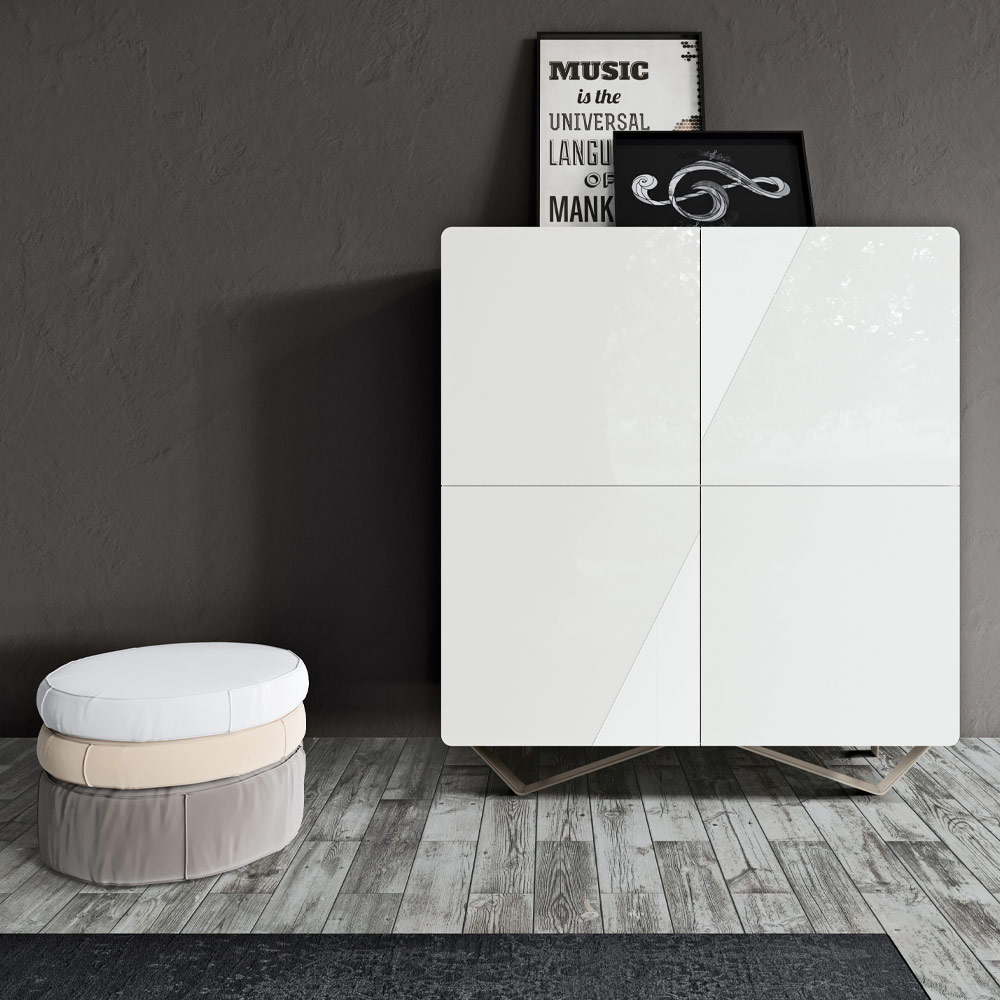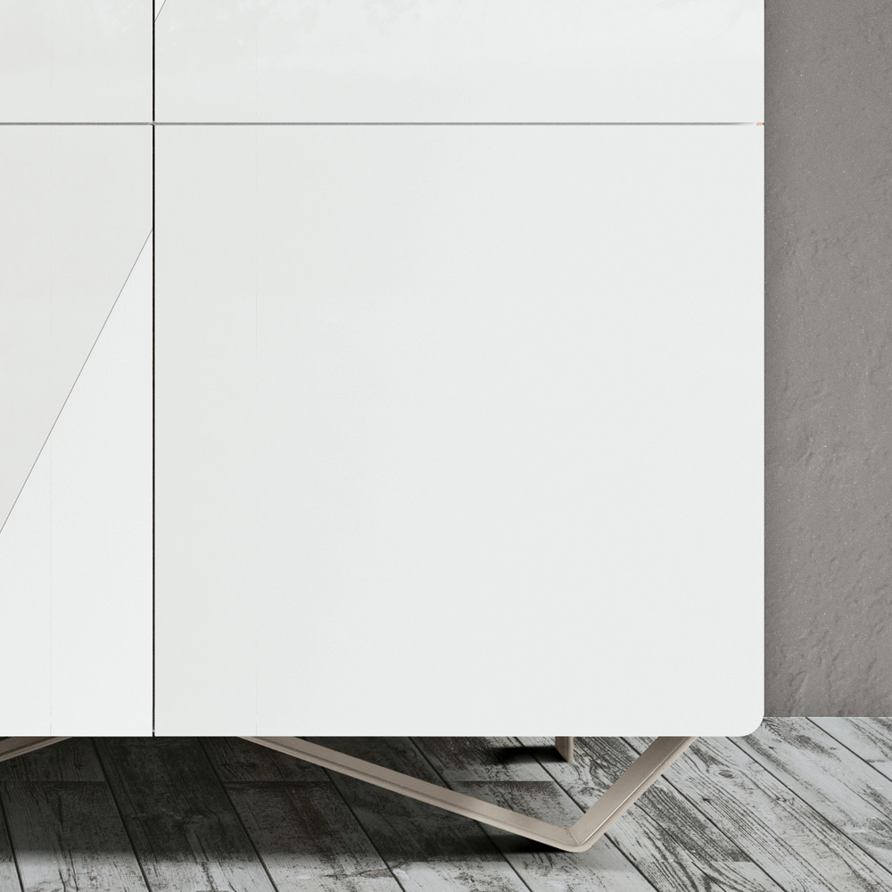 dvířka s bílým sklem s bílými vložkami , zcela vyrobeno v Itálii. Výrobek je součástí nové řady moderních výrobků vyrobených s respektem k přírodě. Tento elegantní příborník se vyznačuje funkčností a vysokou kvalitou italského řemesla.