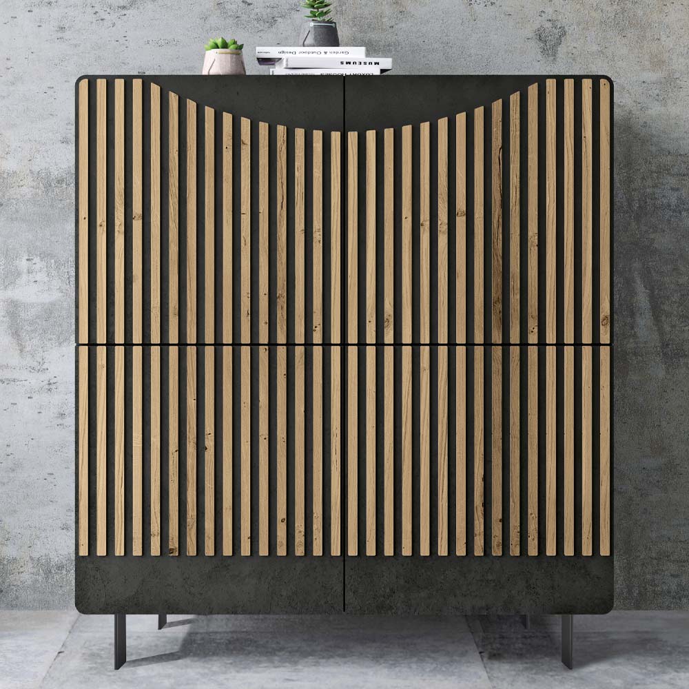 korpusem, vnitřními policemi a dvířky z MDF s povrchovou úpravou dřevěné uhlí a vázaný dub, zadní strana z překližky a