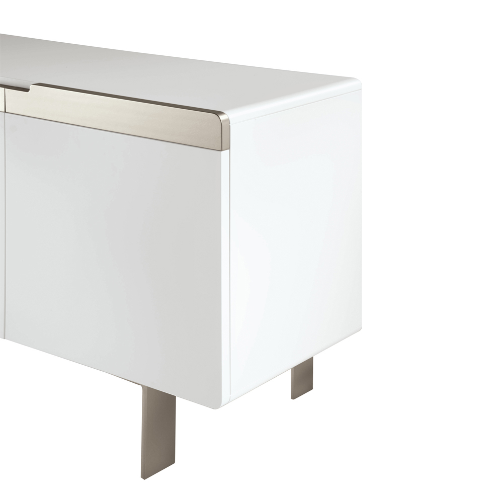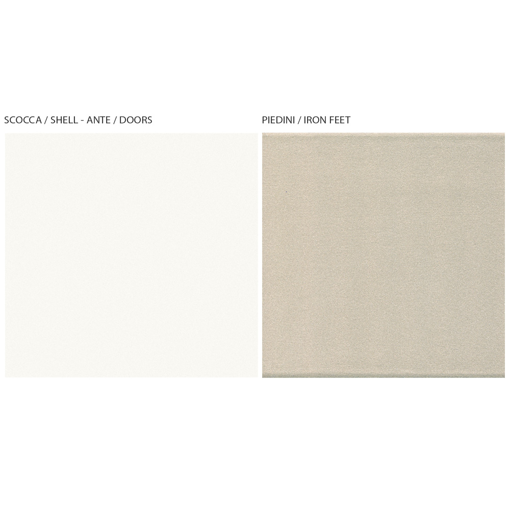 Poniklované železné nohy, bílé MDF tělo a dvířka s