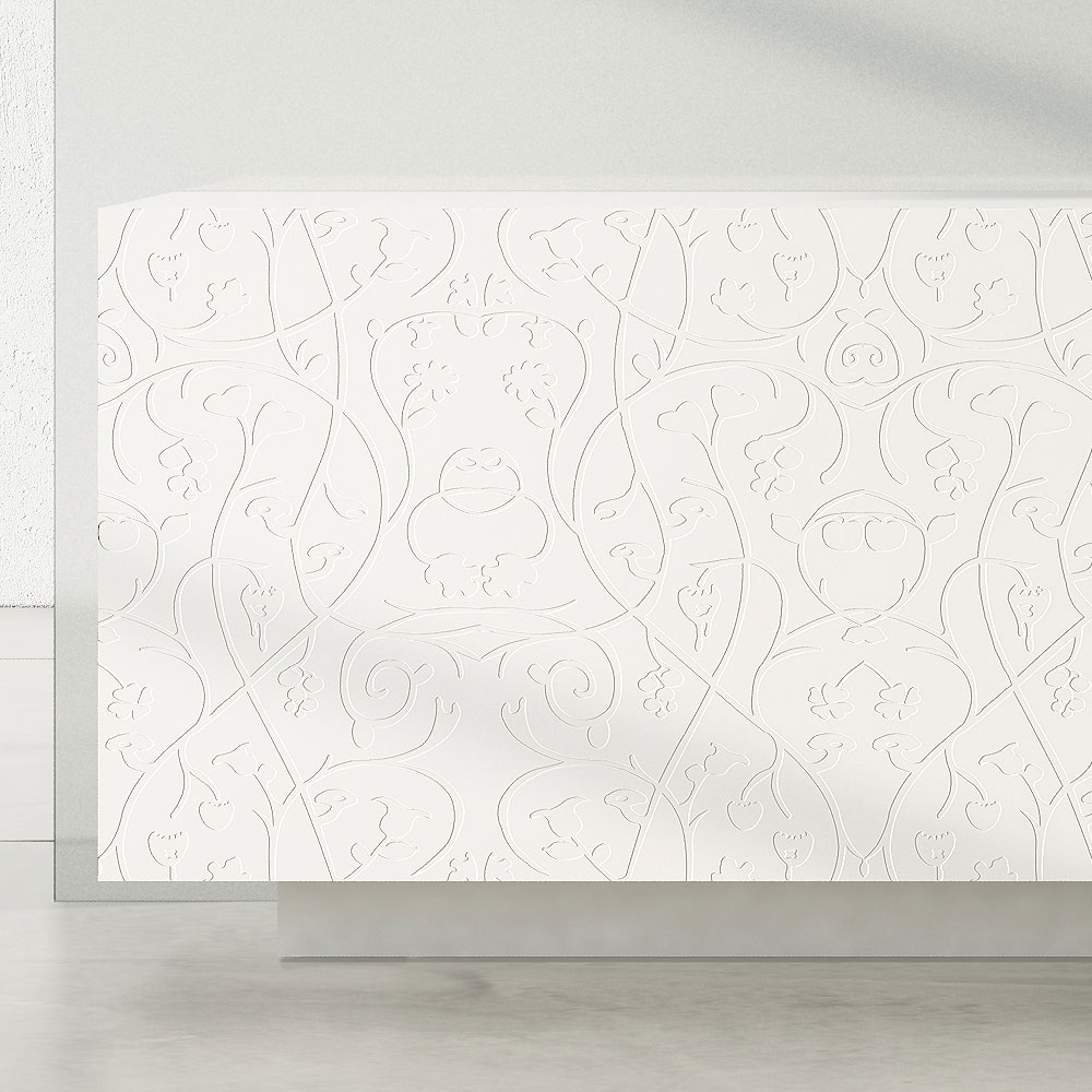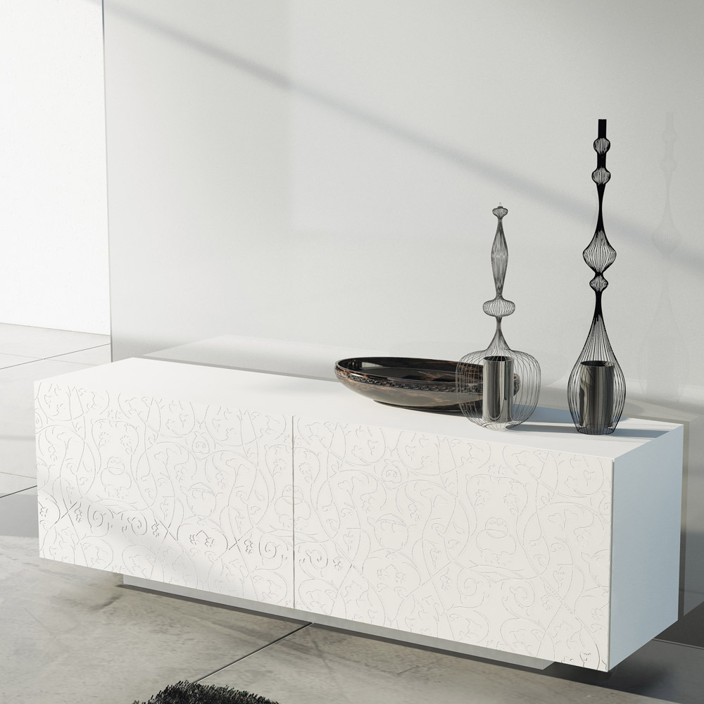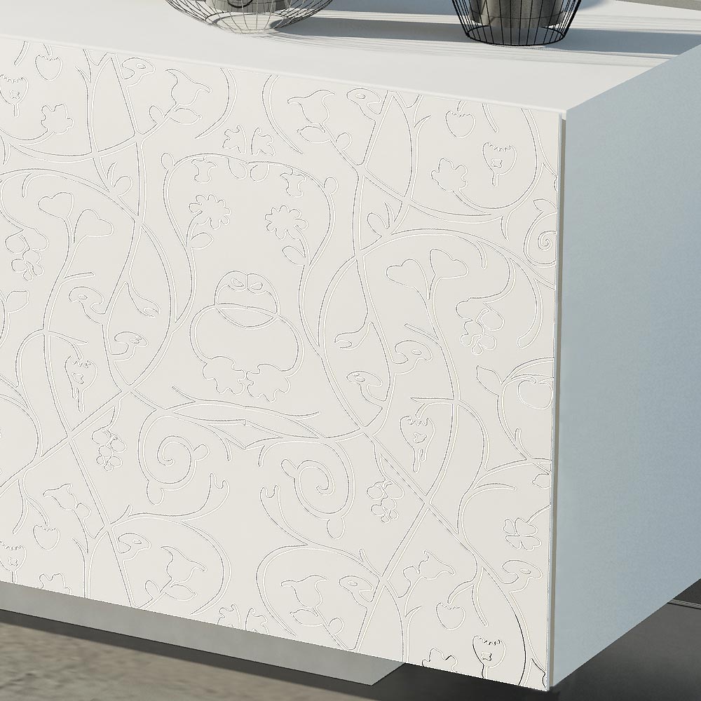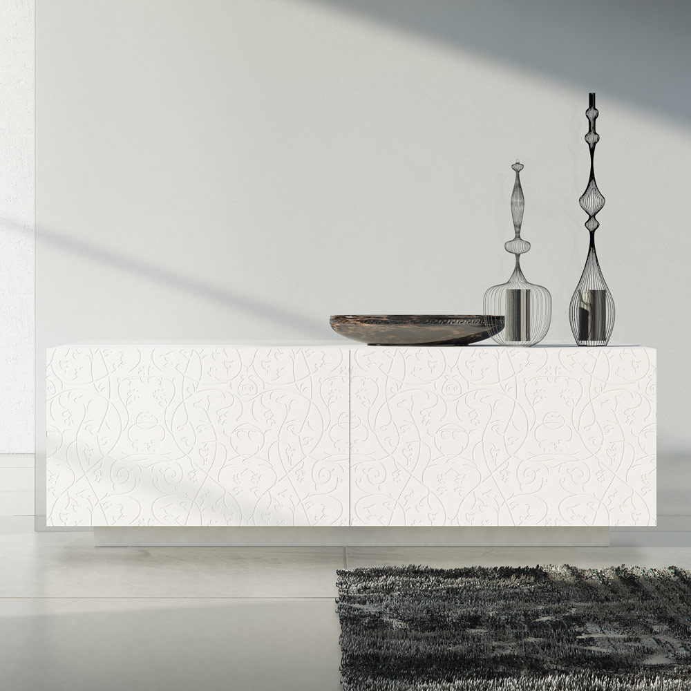 Moderní příborník s bílou matně lakovanou MDF strukturou složený ze 2 koplanárních posuvných dveří které zaručují skvělou funkčnost a praktičnost az lakovaného soklu , který nabízí velkou stabilitu. Tento produkt je plný vkusu a designu díky svým elegantním a rafinovaným povrchovým úpravám a basreliéfnímu zdobení dveří, které je činí jedinečnými ve svém druhu. Různé materiály použité na konstrukci nabízejí vysokou kvalitu a odolnost v průběhu času, což produktu dodává jedinečný a nezapomenutelný nádech.