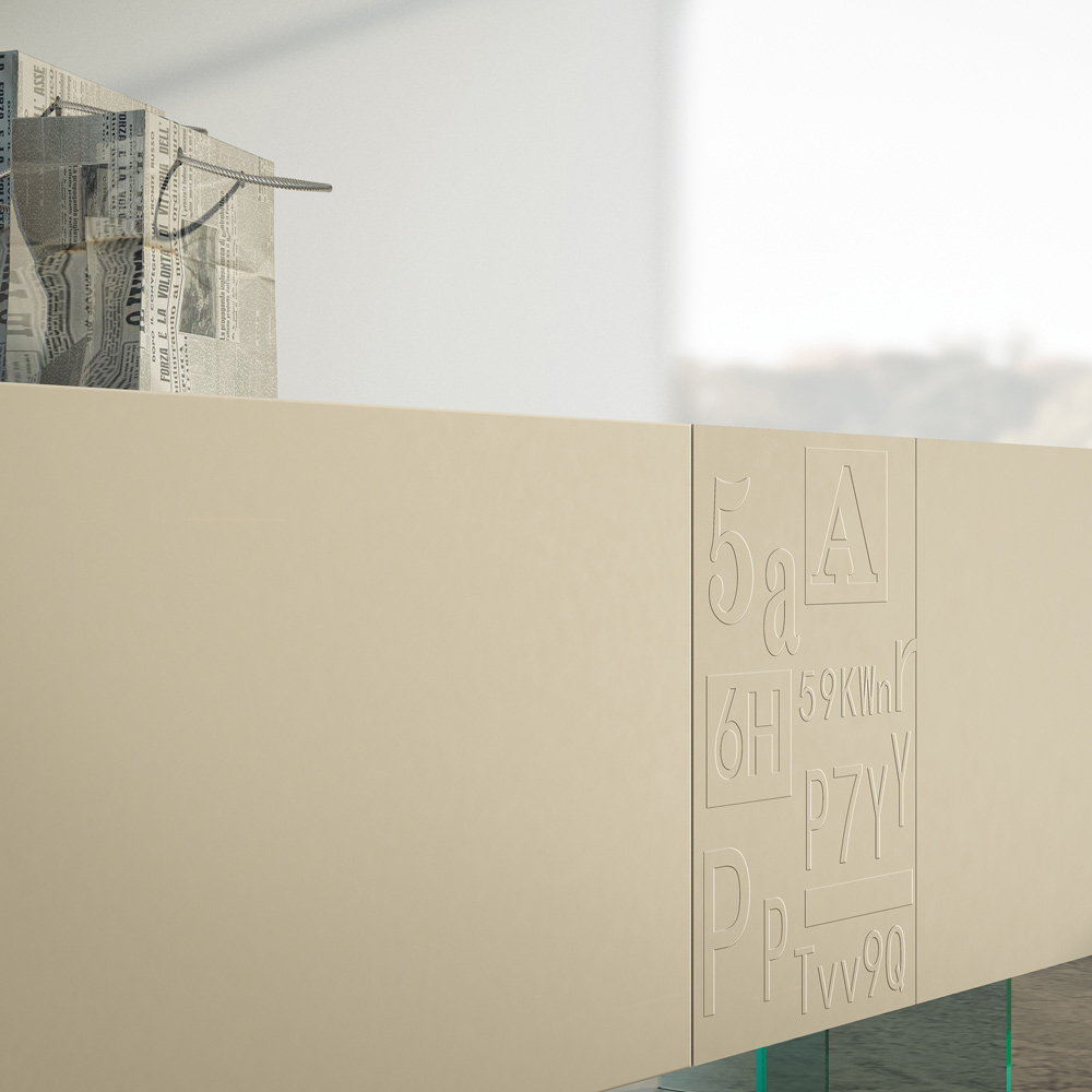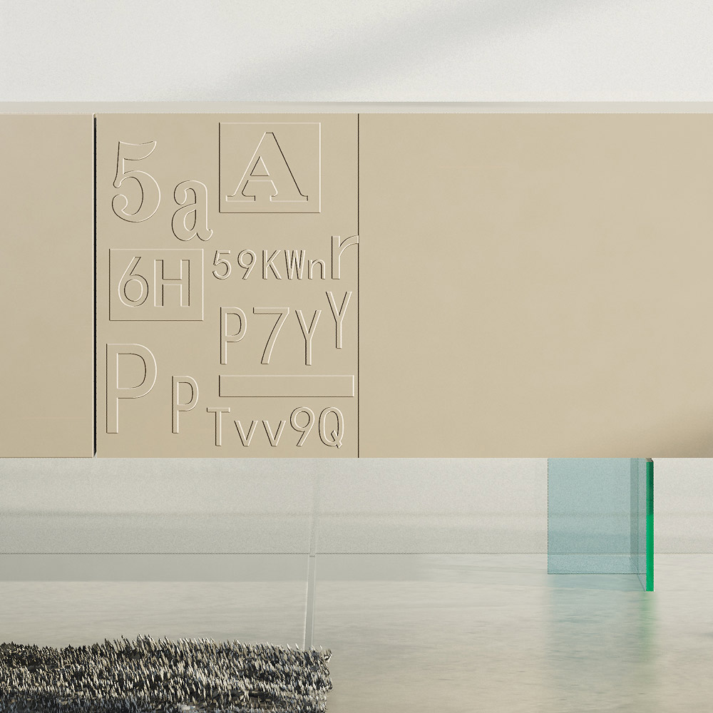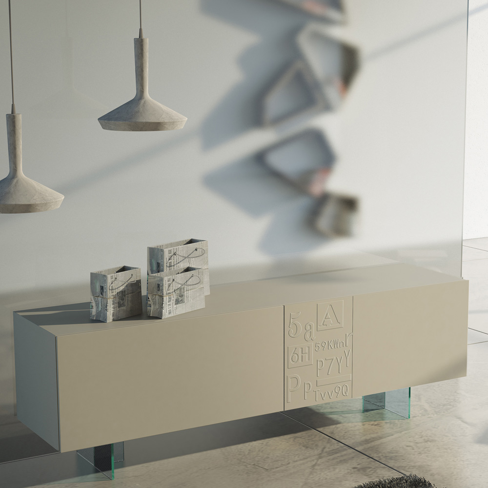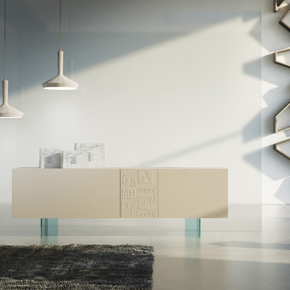 Moderní příborník s matně lakovanou MDF strukturou alpaky složený ze 2 koplanárních posuvných dveří které zaručují skvělou funkčnost a praktičnost a se skleněnými nohami , které nabízejí velkou stabilitu. Tento produkt je plný vkusu a designu díky svým elegantním a rafinovaným povrchovým úpravám a částečnému basreliéfnímu zdobení dveří, které jej činí jedinečným svého druhu. Různé materiály použité na konstrukci nabízejí vysokou kvalitu a odolnost v průběhu času, což produktu dodává jedinečný a nezapomenutelný nádech.