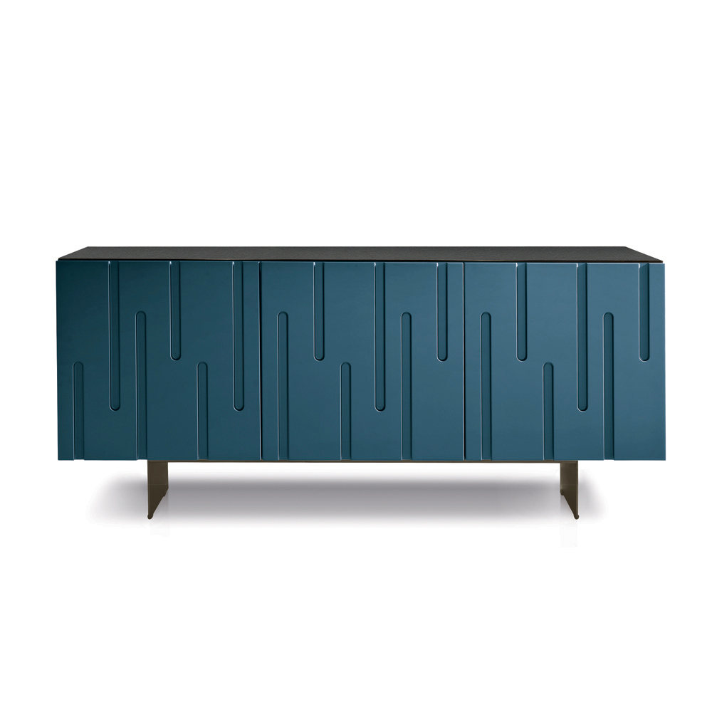 Designová příborník vyrobená v Itálii s dvířky s rytým efektem stalaktitů a kovovou základnou