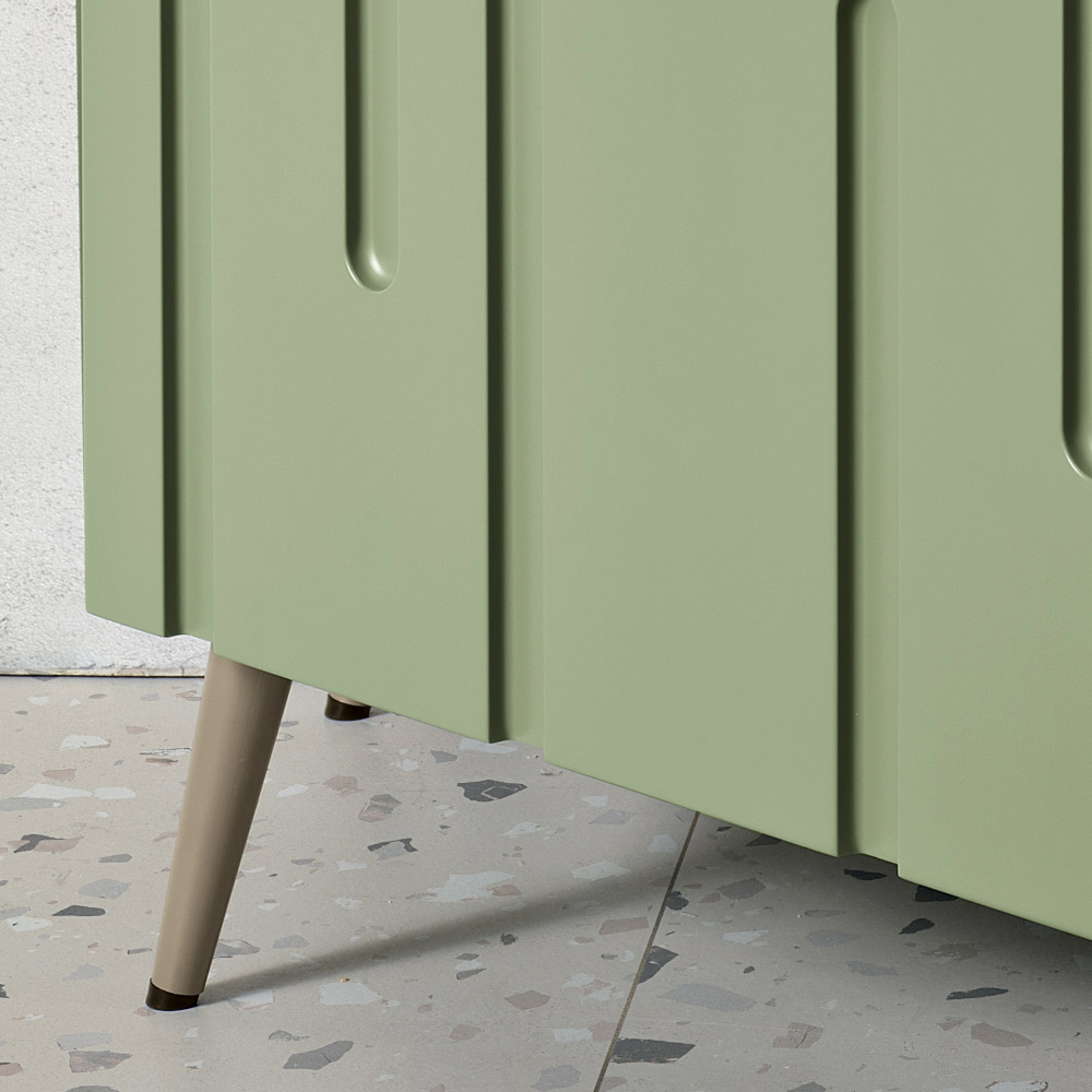 • zelený korpus se zelenými dvířky - 5 kovových nožiček v perleťově béžové barvě 130x38x20 cm
