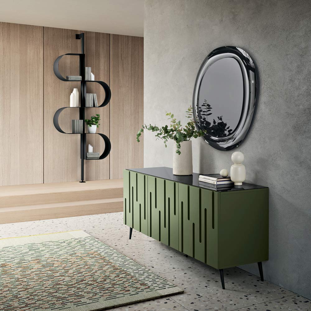 Dveře z MDF s povlakem z PVC se vyznačují nepravidelnými svislými zářezy , které připomínají přirozený tok stalaktitů a stalagmitů a vytvářejí tak rafinovaný, texturovaný a dynamický efekt. Tato souhra reliéfů dodává povrchu hloubku a pohyb, umocňuje světlo a činí z příborníku ústřední prvek prostoru.