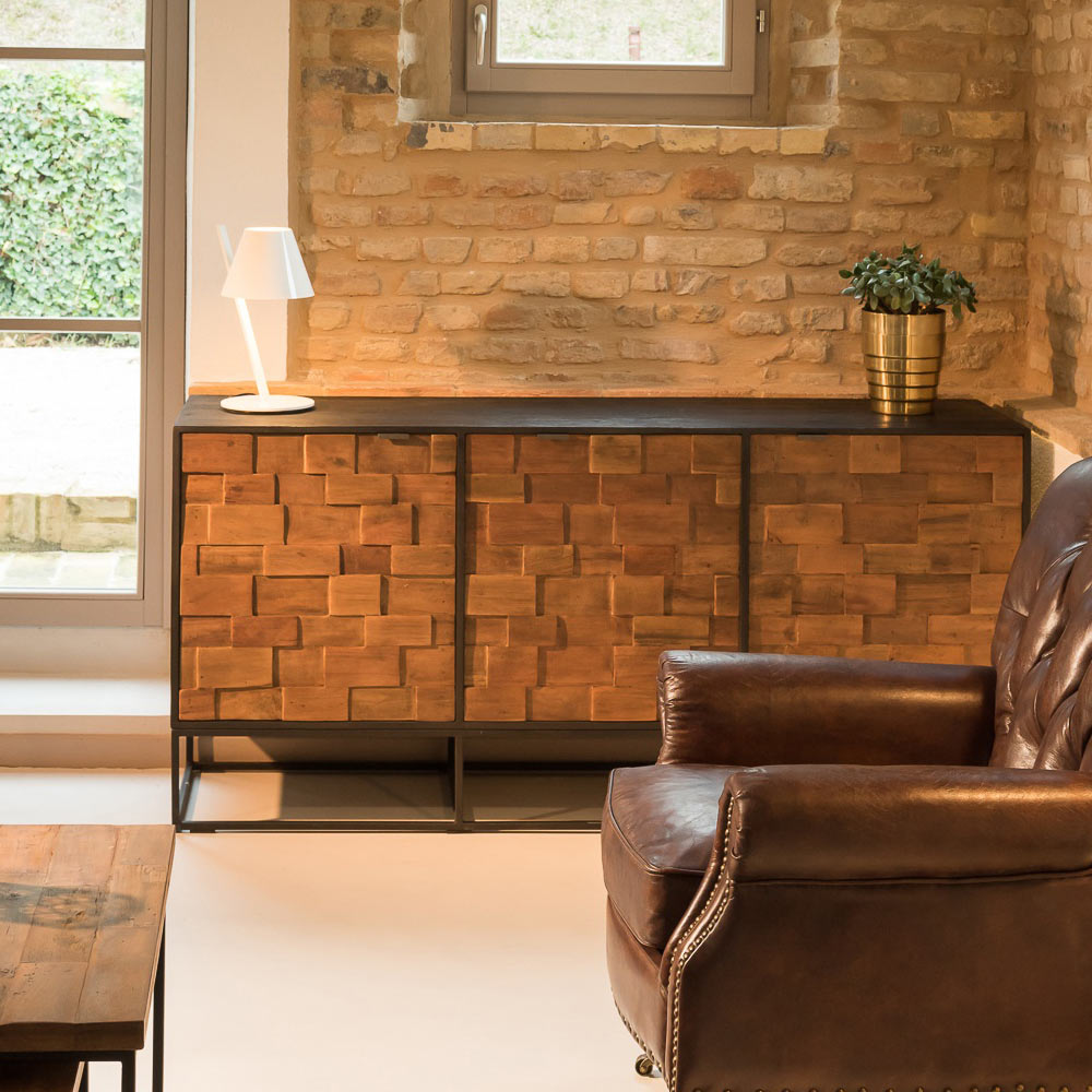Vnitřní příborník z přírodního recyklovaného dřeva v kávové barvě se 3 předními dvířky z patchworkového dřeva a korpusem z kartáčovaného černého kovu.