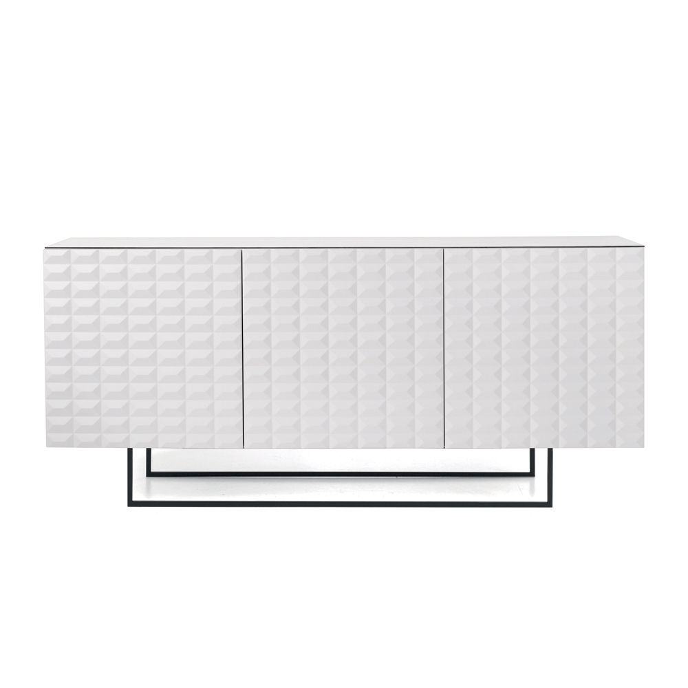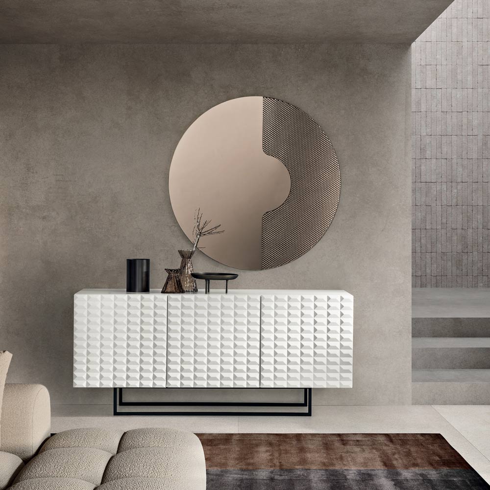 Dveře z MDF s PVC povlakem se vyznačují trojrozměrnou geometrickou texturou připomínající slavné reliéfy s diamantovými hroty , která vytváří fascinující souhru světla a stínu. Tento detail dodává příborníku vizuální hloubku a činí z něj skutečný ústřední bod místnosti.