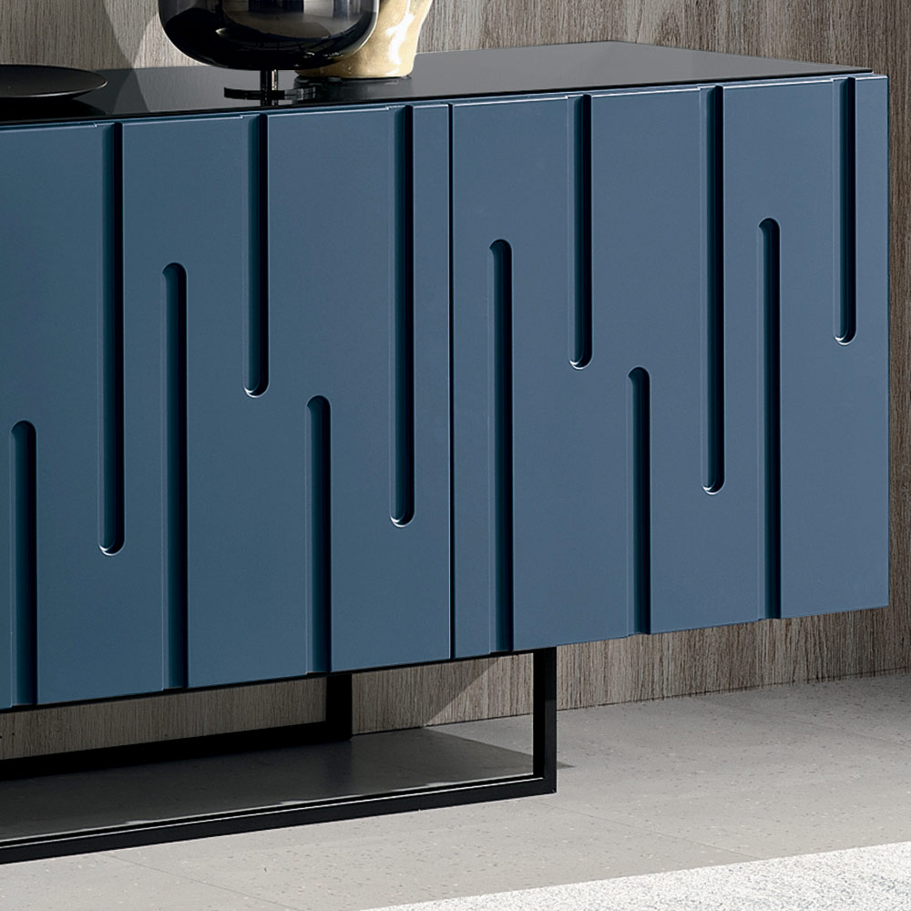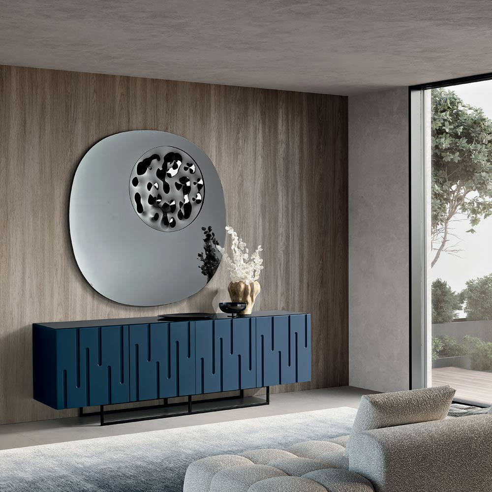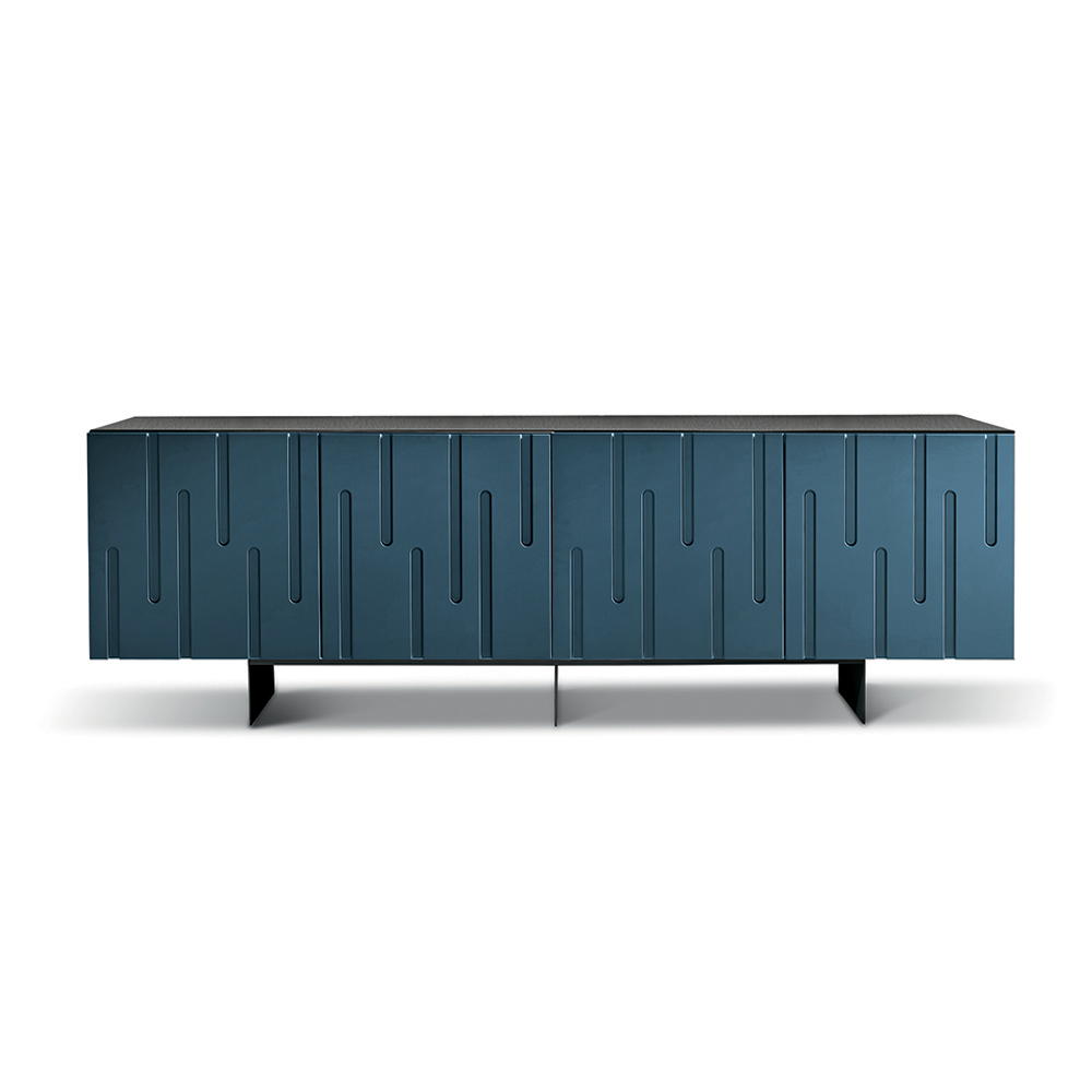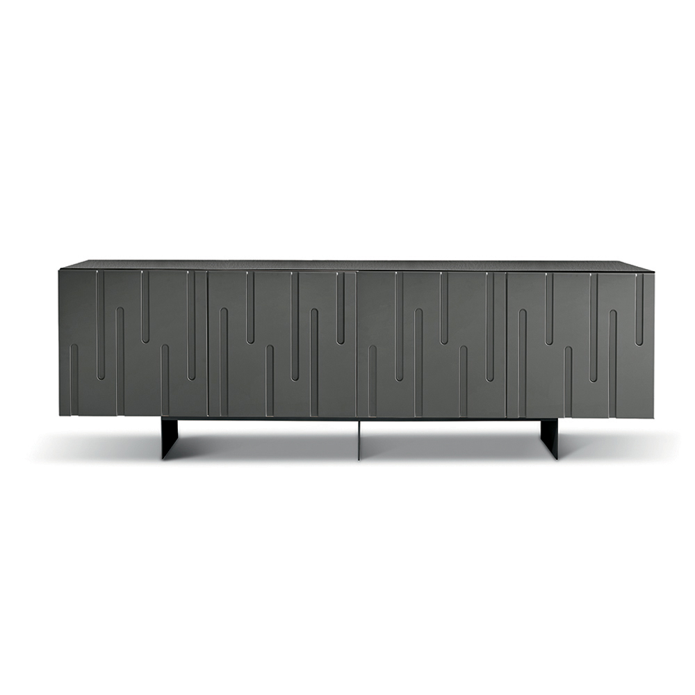 Dveře z MDF s povlakem z PVC se vyznačují nepravidelnými svislými zářezy , které připomínají přirozený tok stalaktitů a stalagmitů a vytvářejí tak rafinovaný, texturovaný a dynamický efekt. Tato souhra reliéfů dodává povrchu hloubku a pohyb, umocňuje světlo a činí z příborníku ústřední prvek prostoru.