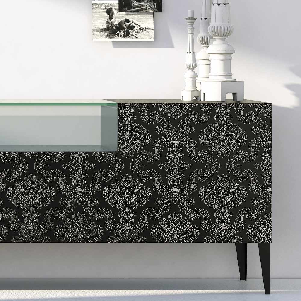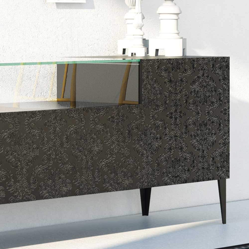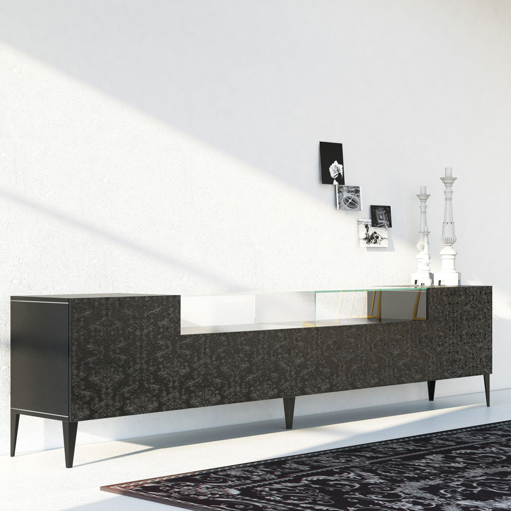 Příborník do obývacího pokoje se strukturou z matně lakované MDF a složený ze 2 tvarovaných výklopných dveří v matném černém laku. Součástí je pouzdro z tvrzeného skla a nožičky z černého kovu . Tento produkt se vyznačuje funkčností a designem díky elegantním a rafinovaným povrchovým úpravám a jedinečné basreliéfní dekoraci . THE různé materiály použité na konstrukci nabízejí vysokou kvalitu a odolnost v průběhu času a dodávají produktu jedinečný a nezapomenutelný nádech.