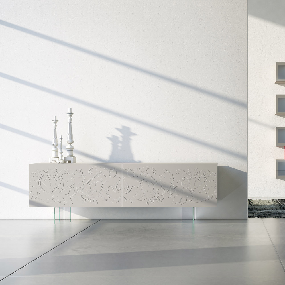 Moderní příborník s bílou matně lakovanou MDF strukturou složený ze 2 koplanárních posuvných dveří které zaručují skvělou funkčnost a praktičnost a s extra čirými skleněnými nožičkami . Tento produkt je plný vkusu a designu díky svým elegantním a rafinovaným povrchovým úpravám a jedinečné basreliéfní výzdobě dveří. Různé materiály použité na konstrukci nabízejí vysokou kvalitu a odolnost v průběhu času, což produktu dodává jedinečný a nezapomenutelný nádech.