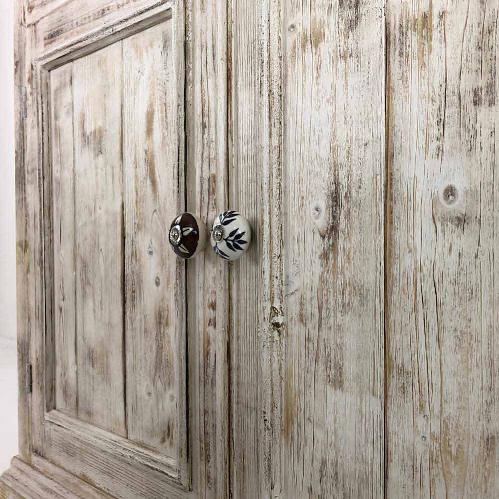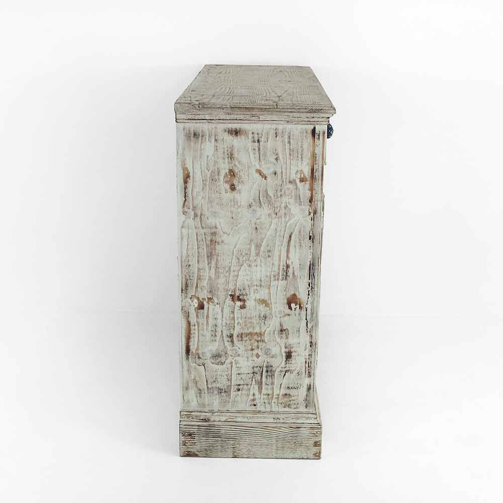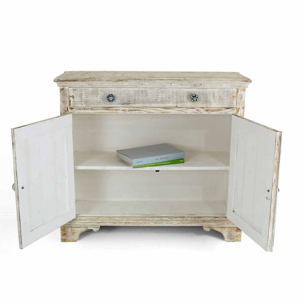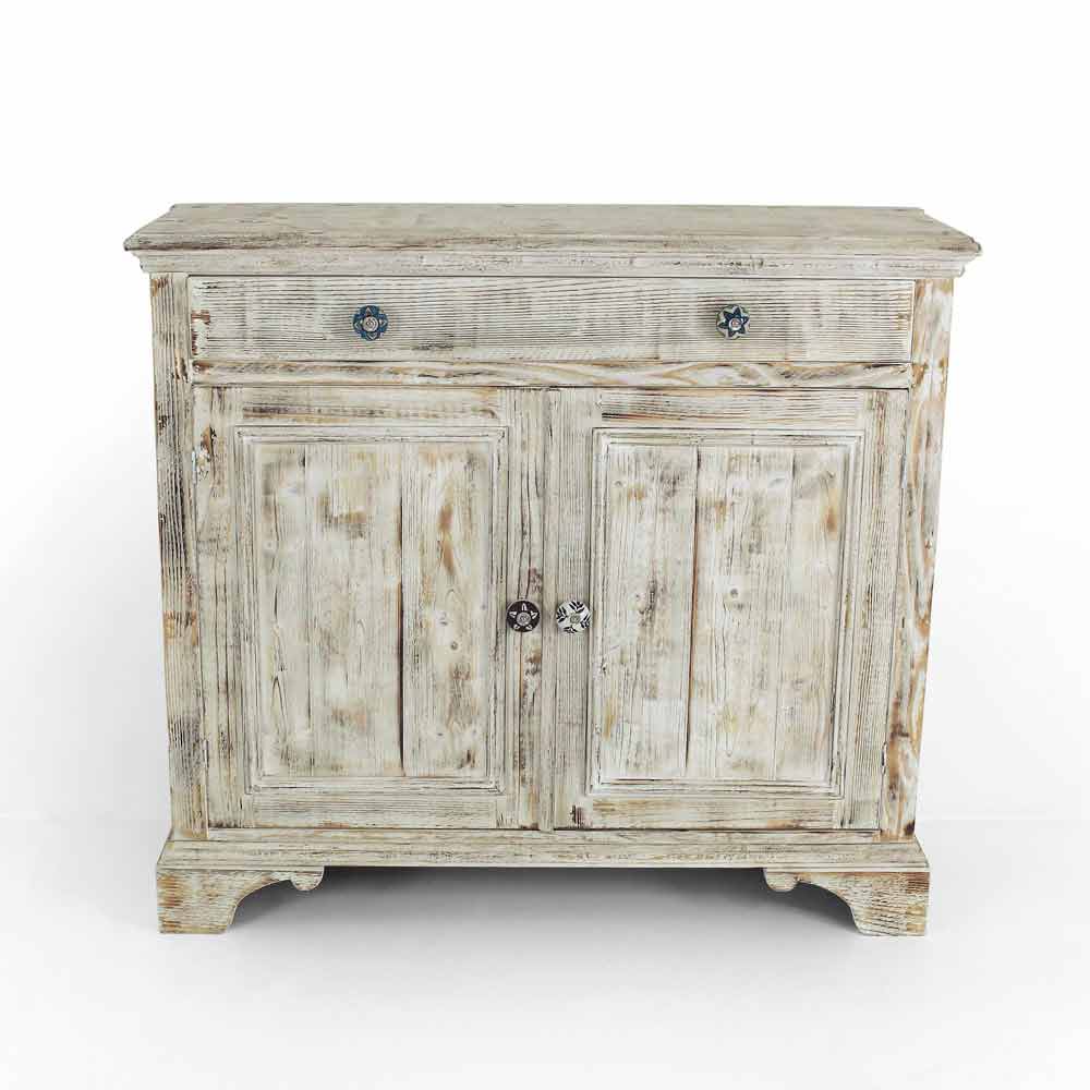 Příborník z masivního jedlového dřeva, zcela ručně vyráběný v Itálii, který se vyznačuje nádhernou povrchovou úpravou spálenou plamenem, která zdůrazňuje zvláštní zrno dřeva, díky kterému je produkt jedinečný. Příborník je poté dokončen starou bílou barvou a doplněn transparentním povrchem, který je vodoodpudivý a fixuje barvy tak, aby byly časem nezměnitelné. Jeho struktura zahrnuje 2 dveře s vnitřní poličkou a 1 zásuvku s dnem z topolové překližky, které jsou doplněny speciálními ručně malovanými keramickými knoflíky, které vám umožní mít dokonale uspořádané prostory.