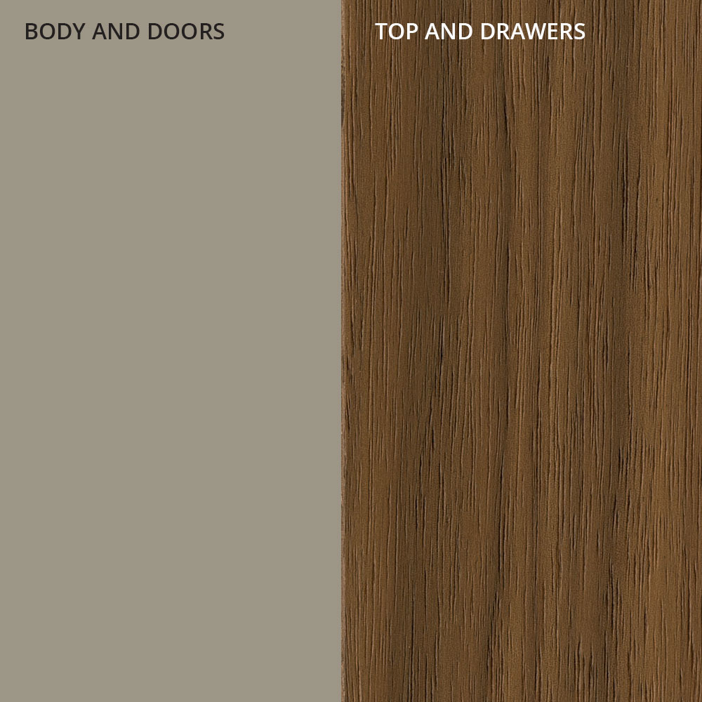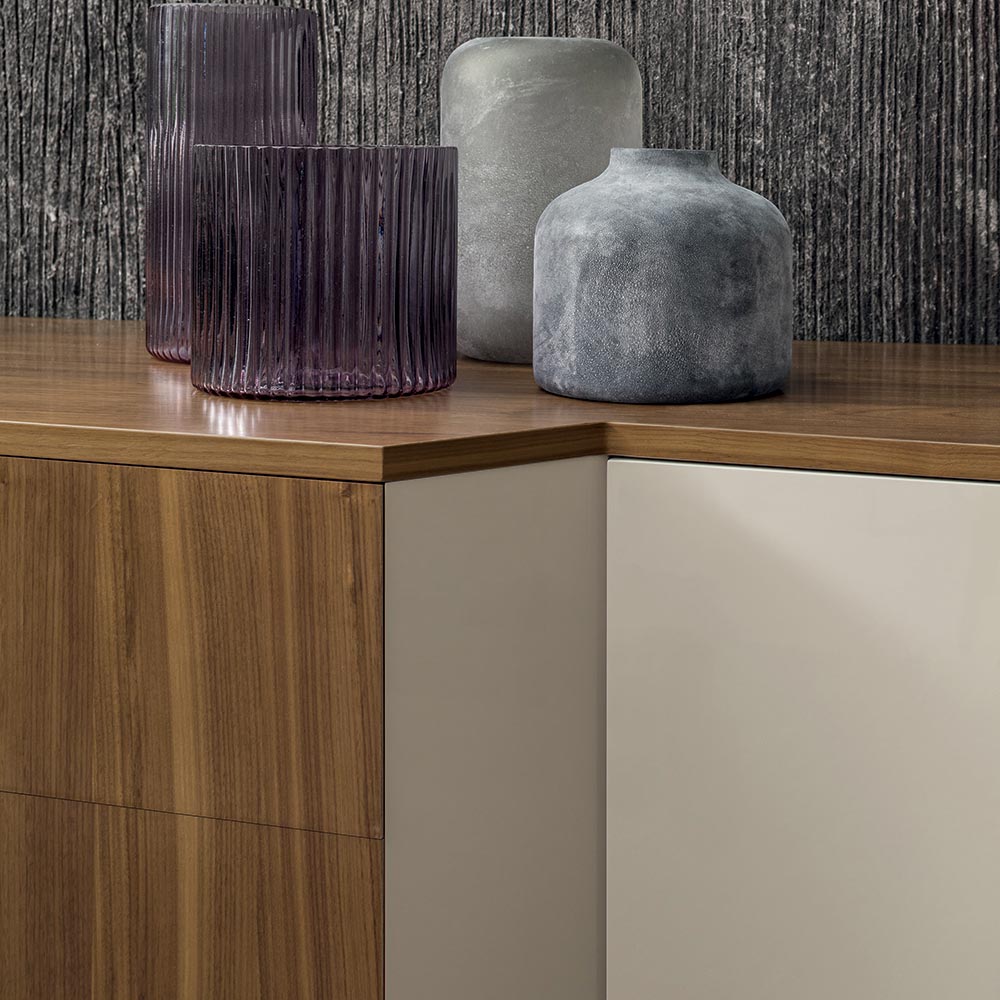 Tento příborník do obývacího pokoje má konstrukci vyrobenou výhradně z lakované MDF v pískové úpravě a horní a 2 zásuvky z dýhovaného dřeva v provedení ořech Canaletto.