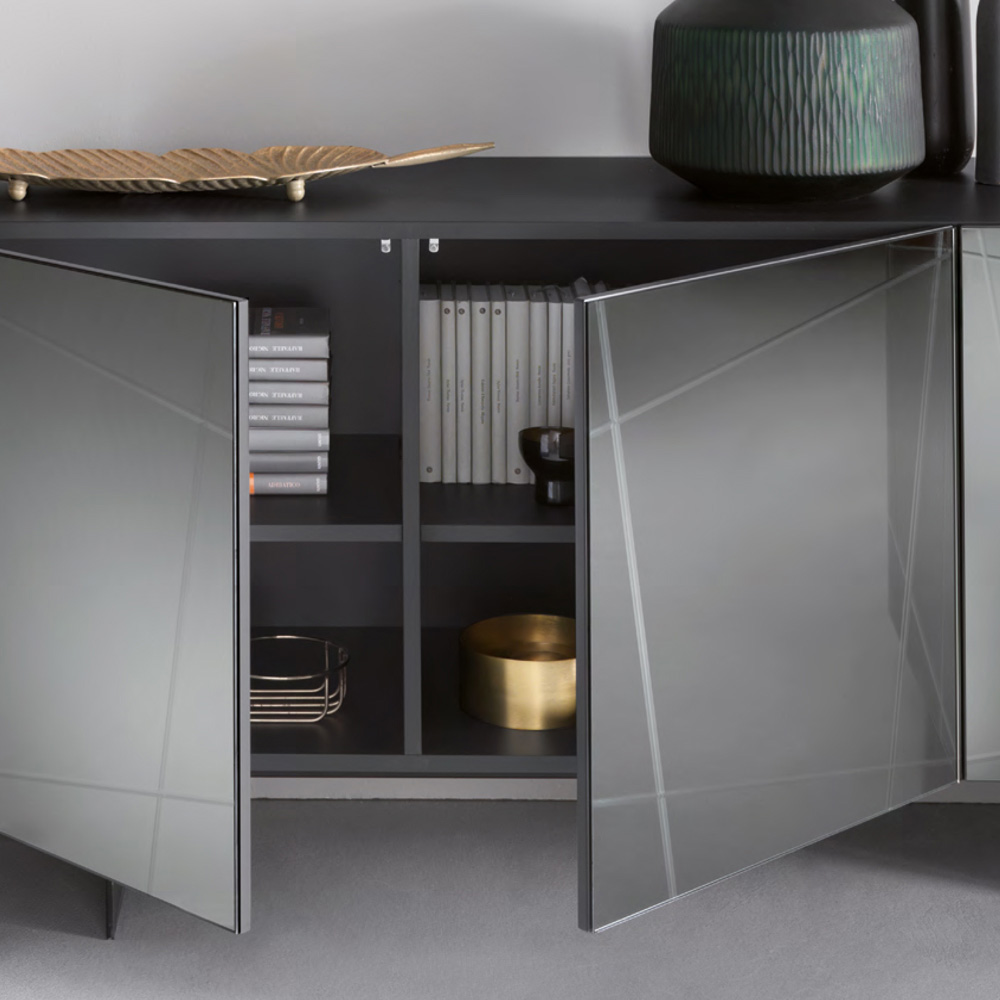 Moderní melaminový příborník s dvířky pokrytými zrcadlem Made in Italy.