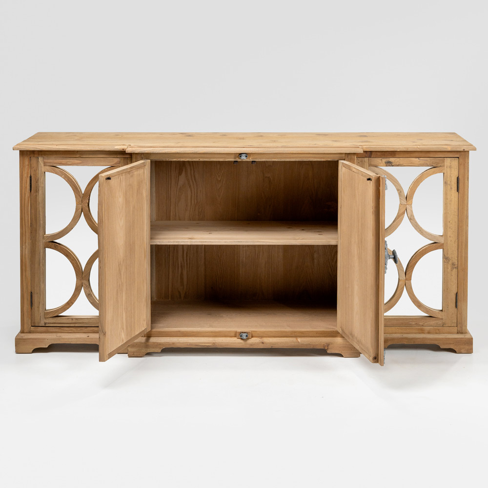 Tato příborník z přírodní borovice ve stáří je výrazným kusem nábytku s elegantními zrcadlovými dvířky , která dodávají místnosti jas a hloubku. Stará povrchová úprava zvýrazňuje texturu dřeva a zdůrazňuje jeho kresbu, suky a přirozené nerovnosti.