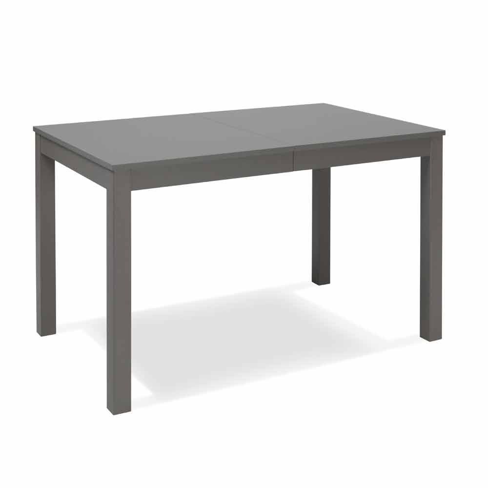 Rozkládací jídelní stůl s nohami z masivního bukového dřeva ve světle šedé barvě. Svršek, pásky a nástavce ze světle šedého melaminu. Přípony se vloží do tabulky.