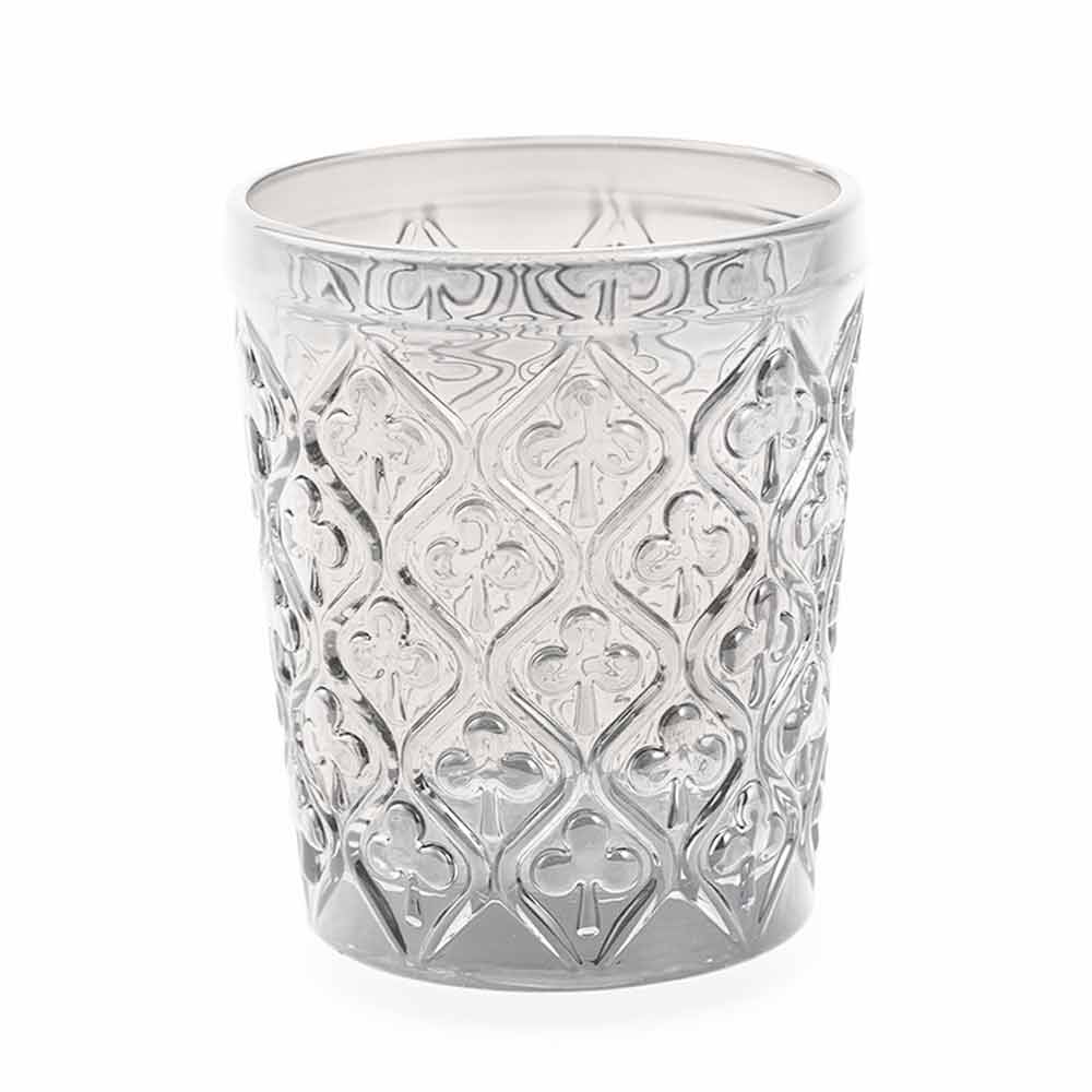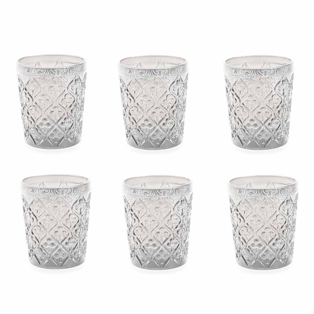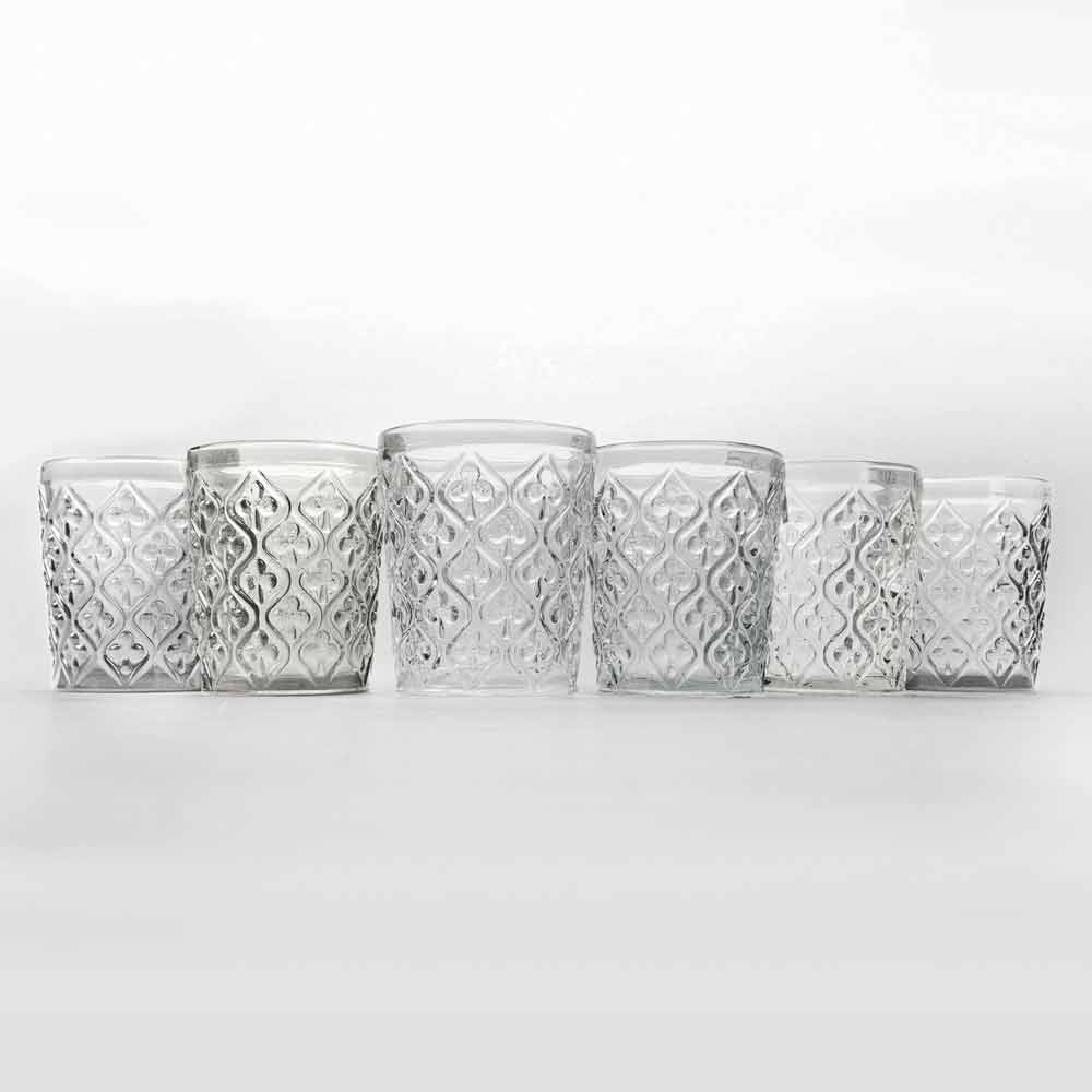 Sklenice na vodu z průhledného skla s ozdobnými arabeskami, 12 kusů.