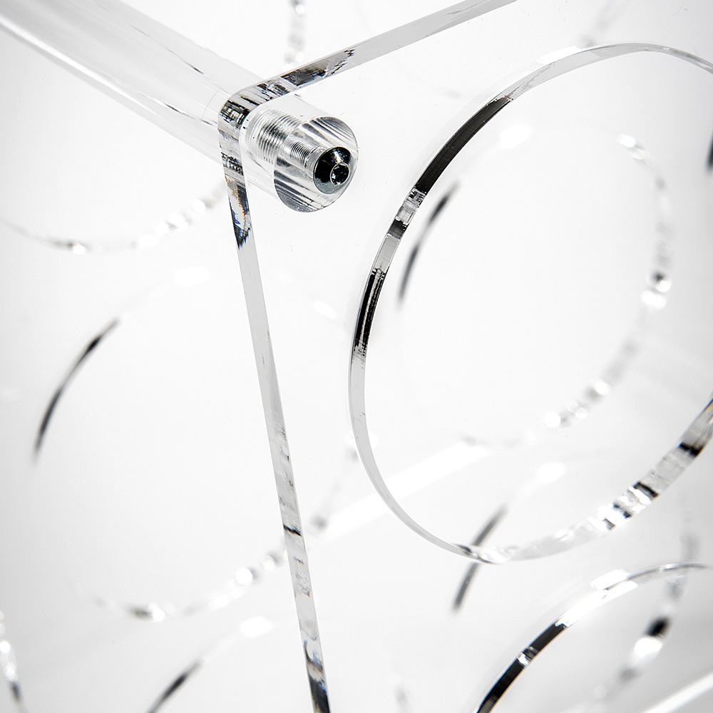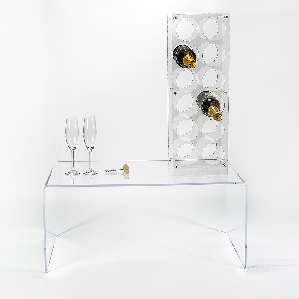 Stojanový stojan na lahve zcela vyrobený v Itálii z PMMA plexiskla 100% z panenského polymeru a listů dřevité esence, umožňuje uložit až 12 lahví vína a šampaňského. Praktický pro udržování pořádku ve vínech a nápojích, skvěle poslouží jako designový kus nábytku díky funkční estetice a originálnímu tvaru připomínajícímu tvar vinného sudu.