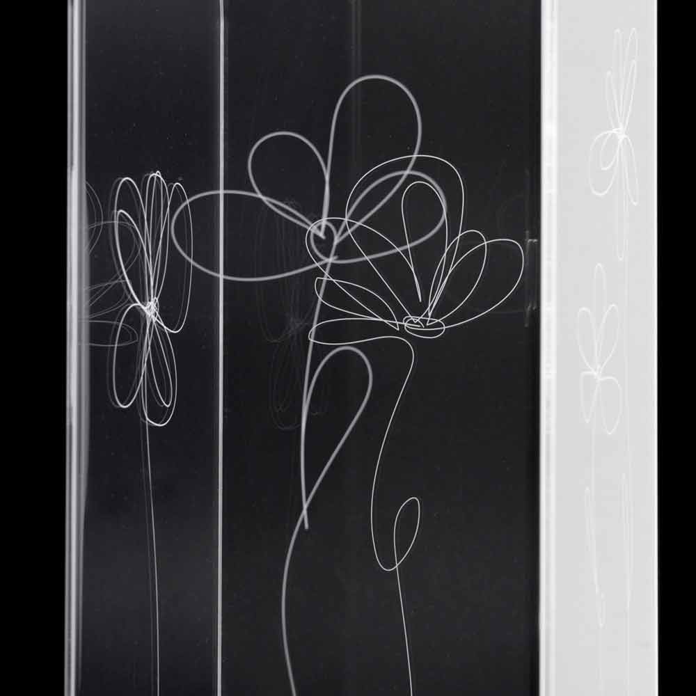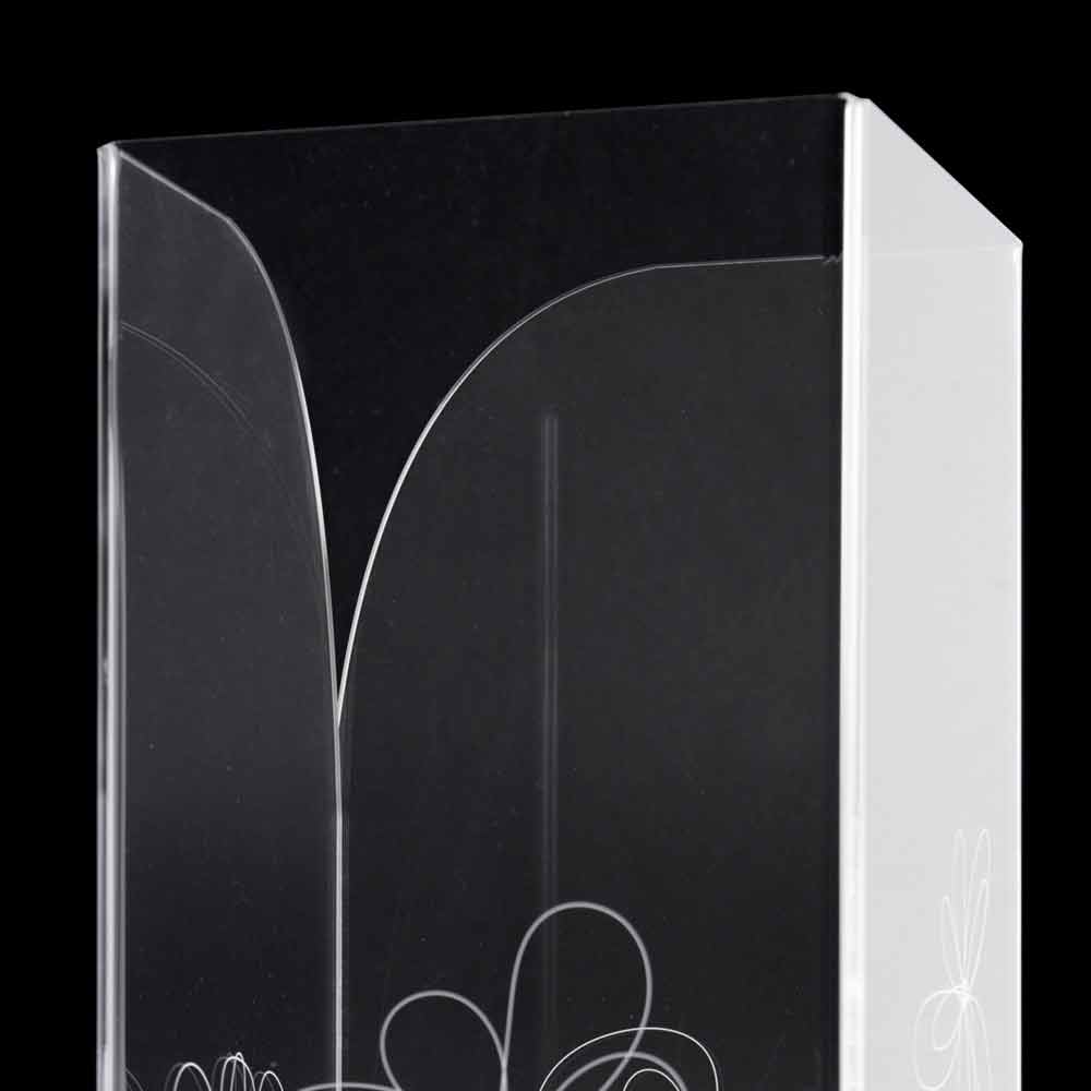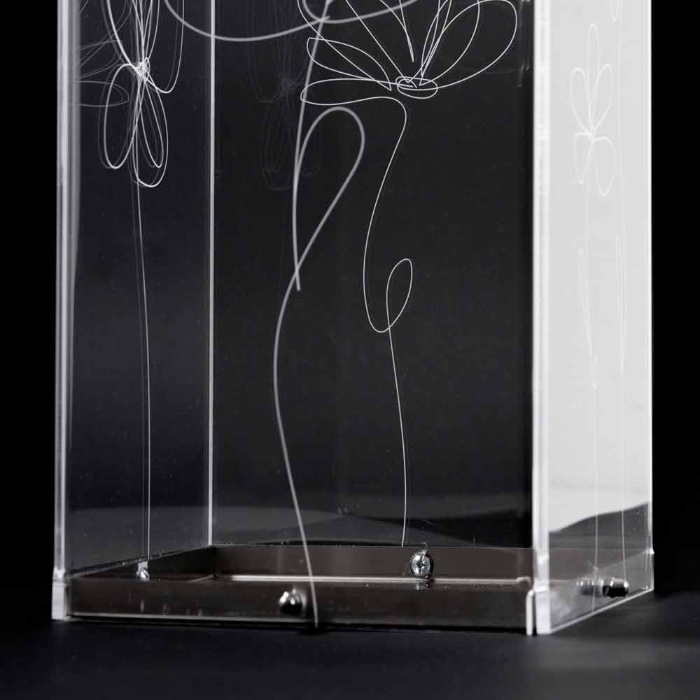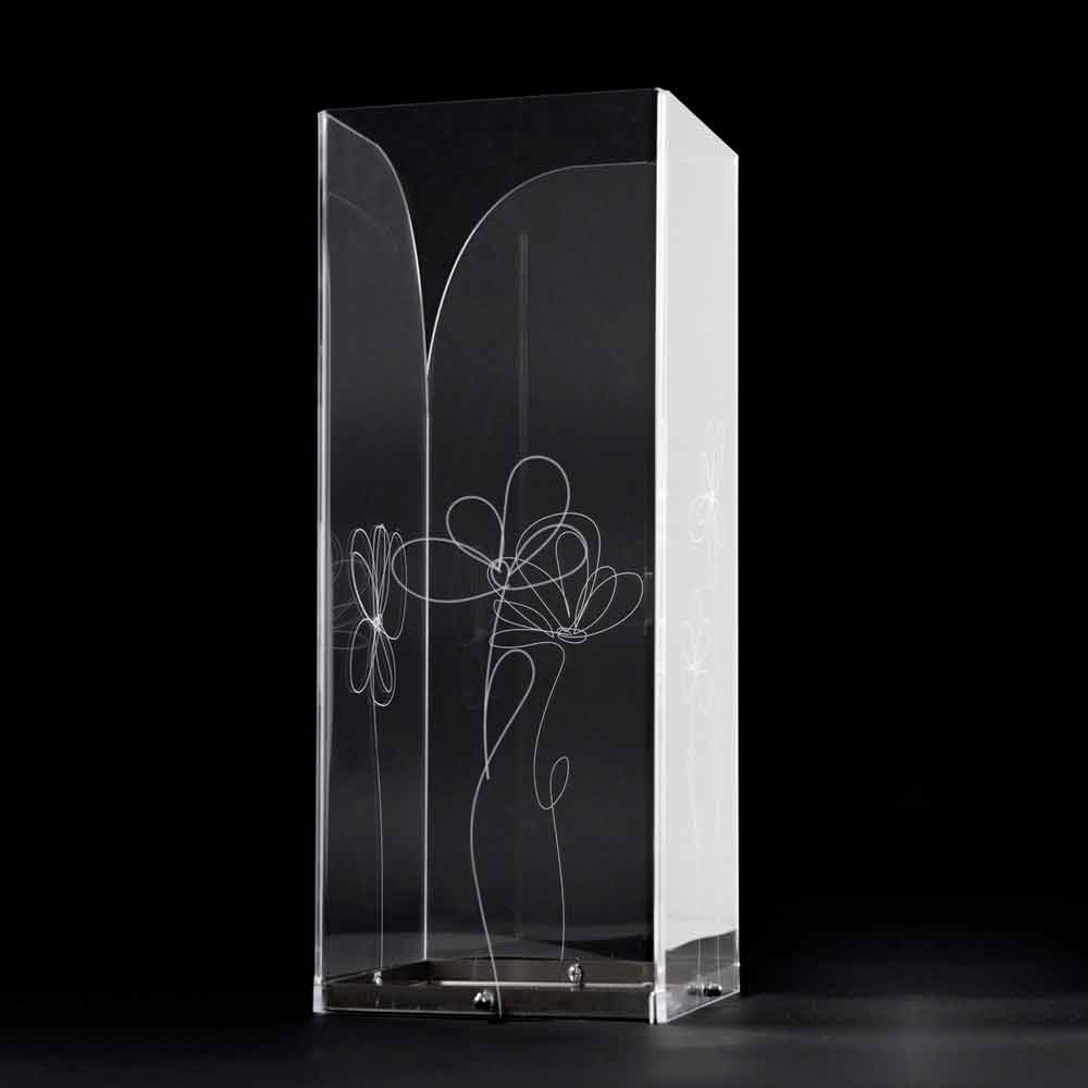 Stojan na deštník z průhledného plexiskla, který se vyznačuje laserem značenými květinovými dekoracemi se stylizovaným stylem s nerezovou základnou.