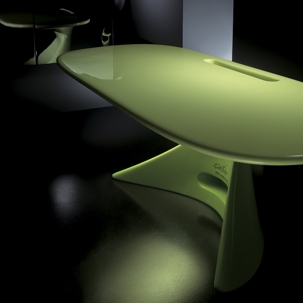 Tento stůl má samonosné tělo vyrobené lisováním termosetových pryskyřic a vyztužené skelným vláknem.