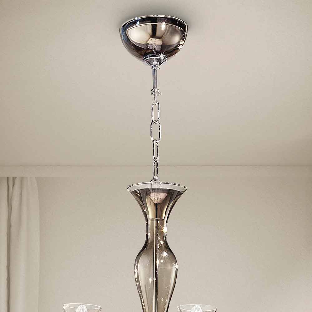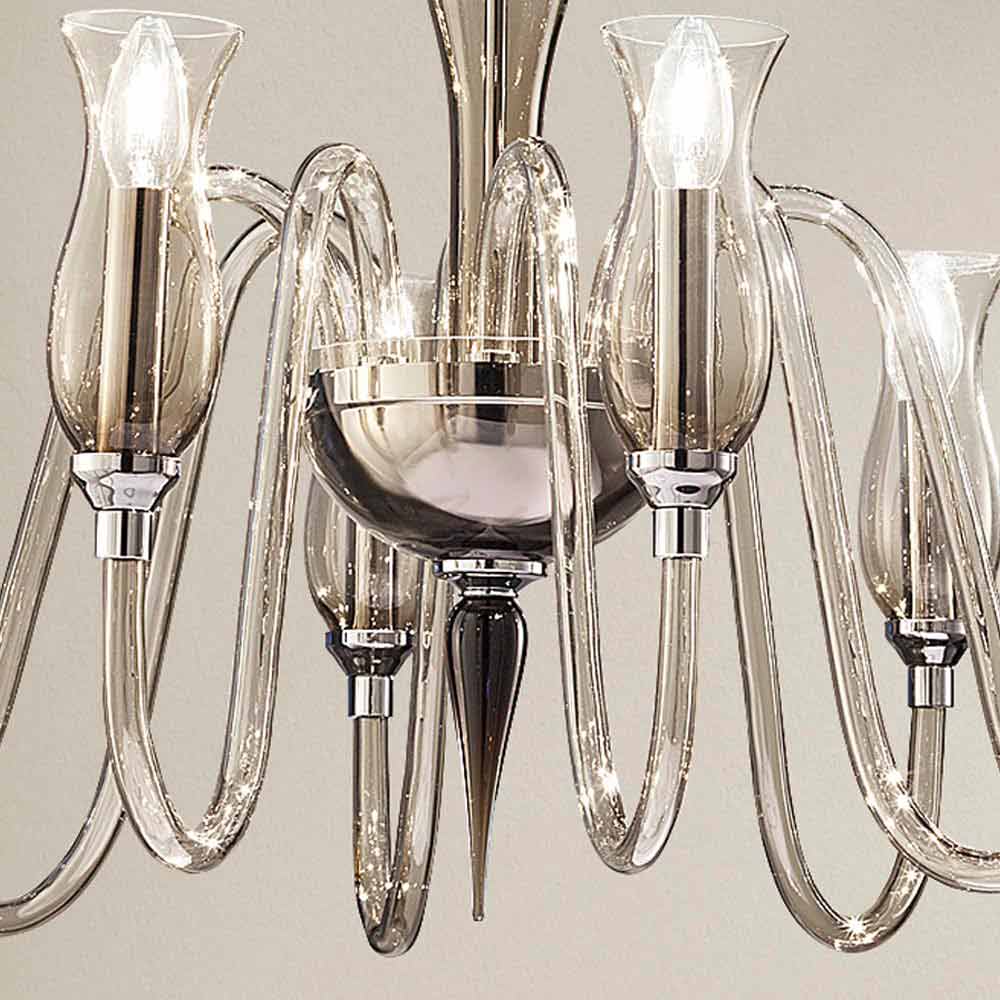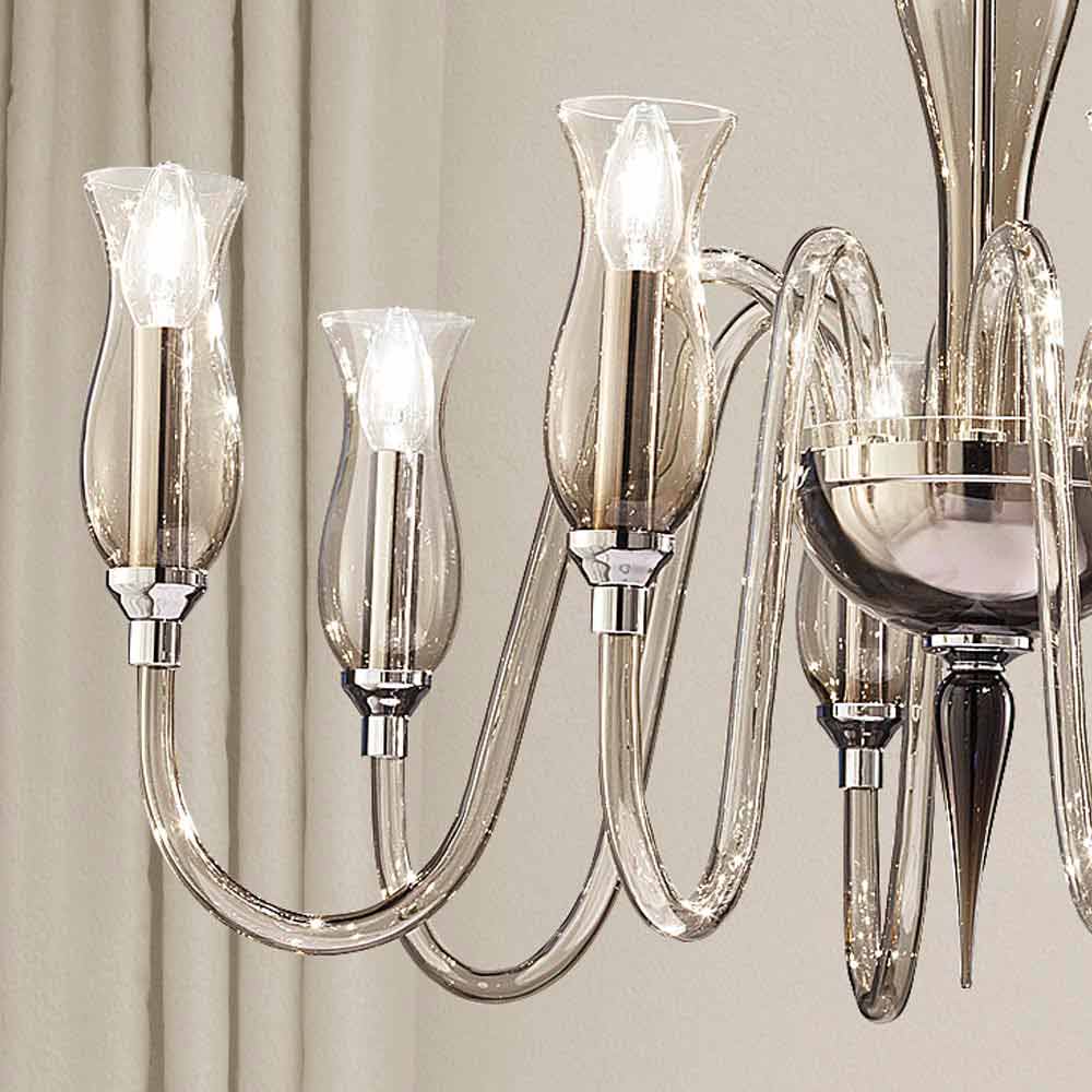 Rafinovaný lustr s osmi světly v ručně vyrobeném benátském skle v kouřovém provedení s detaily z leštěného chromovaného kovu , ručně vyráběný v Itálii. Díky majestátu, který podtrhuje její tvary, se z ní stává protagonista scény, ideální pro umístění do středu místnosti, do obývacího pokoje nebo do velké elegantní ložnice pro sugestivní a romantickou atmosféru. Jeho zvláštnost představuje hladký povrch skla, který zdůrazňuje hru průhlednosti a nádherné zářivé efekty světla pro výsledek se silným vizuálním dopadem.